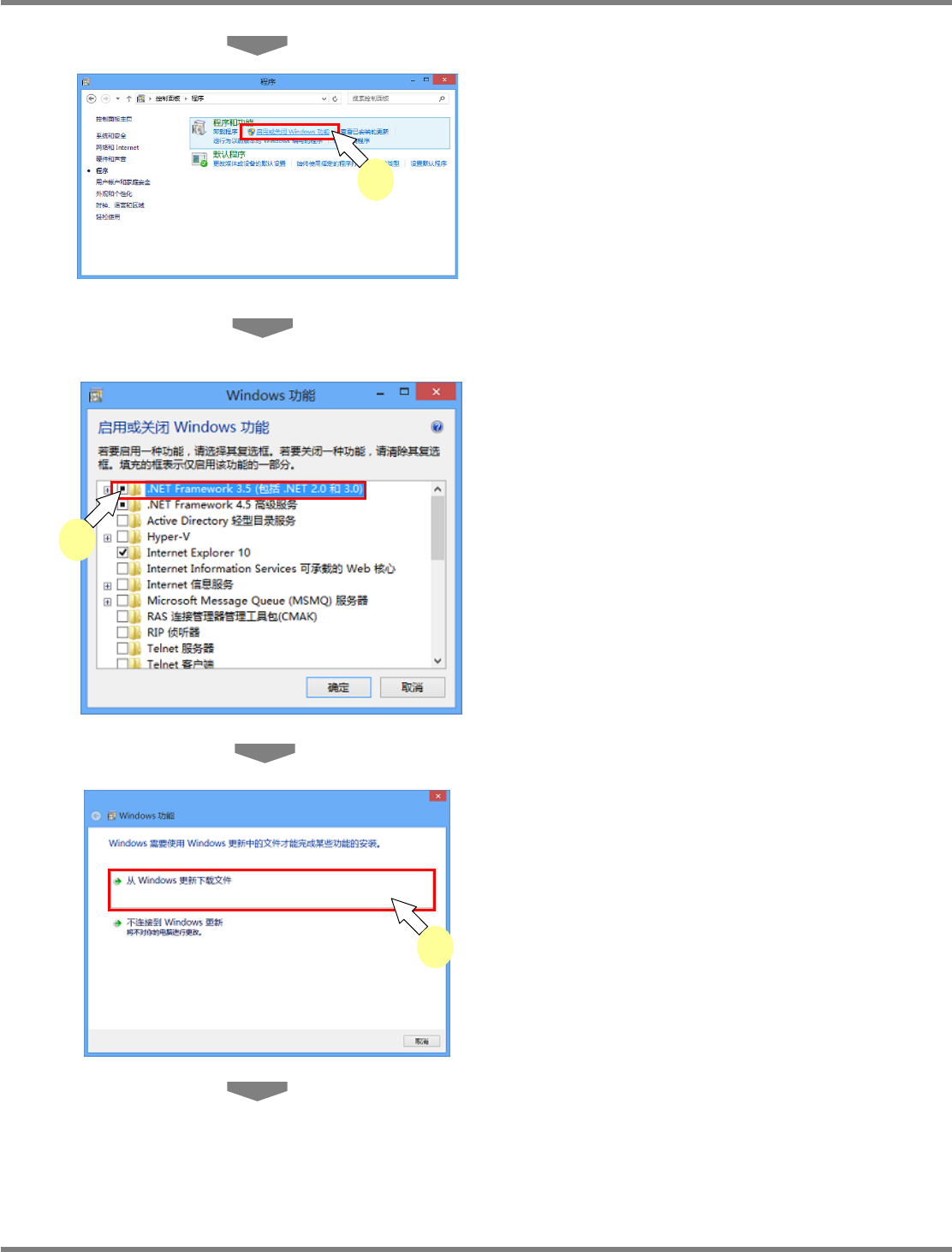 NPM / AM LNB 2.7 品质信息数据库的安装 Page 2-44 EJM5DC-MB-02L-0 3 4 点击 [ 启动或关闭 Windows 功能 ] 。 5 选择 [.NET Framework 3.5( 包括 .NET 2.0 和 3.0)] ,点击 [OK] 。 6 点击 [ 从 Windows 更新下载文件 ] 。 2-5106 2-5104 2-5105 4 5 6