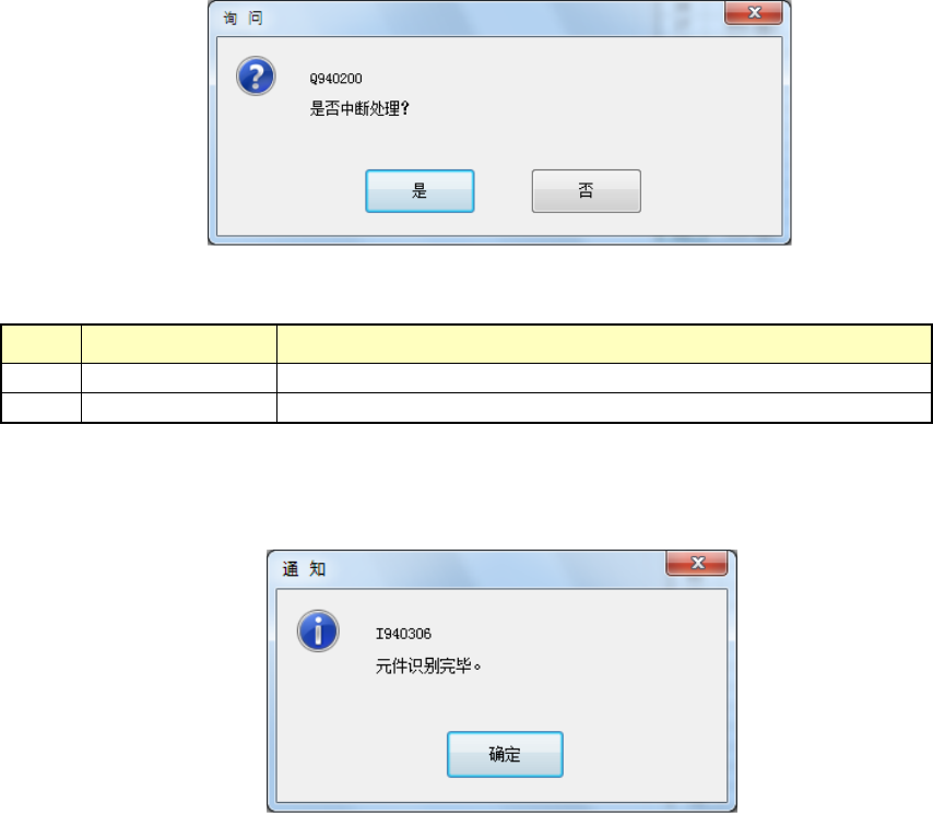 FCS 使用说明书 26 按下 [FCS 生产 模式 ]-[ 执行调整生产 ] 按钮, 显示 [ 识别贴 片元件 ] 画面 时, 自动开始 识别动作 ,显 示 下图 所示 的识别结果。 按下 [ 再识别贴片元件 ] 按钮 显示 [ 识别贴片元 件 ] 画面 时, 按下 [ 执行 ] 按钮 ,开 始 识别贴片 元件动作。 基板没 有夹紧时,显示 [ 基板搬送控制 ] 画面,需要夹紧基板 。 图 2-13 正在 识别贴片元件 表 2-7 正…