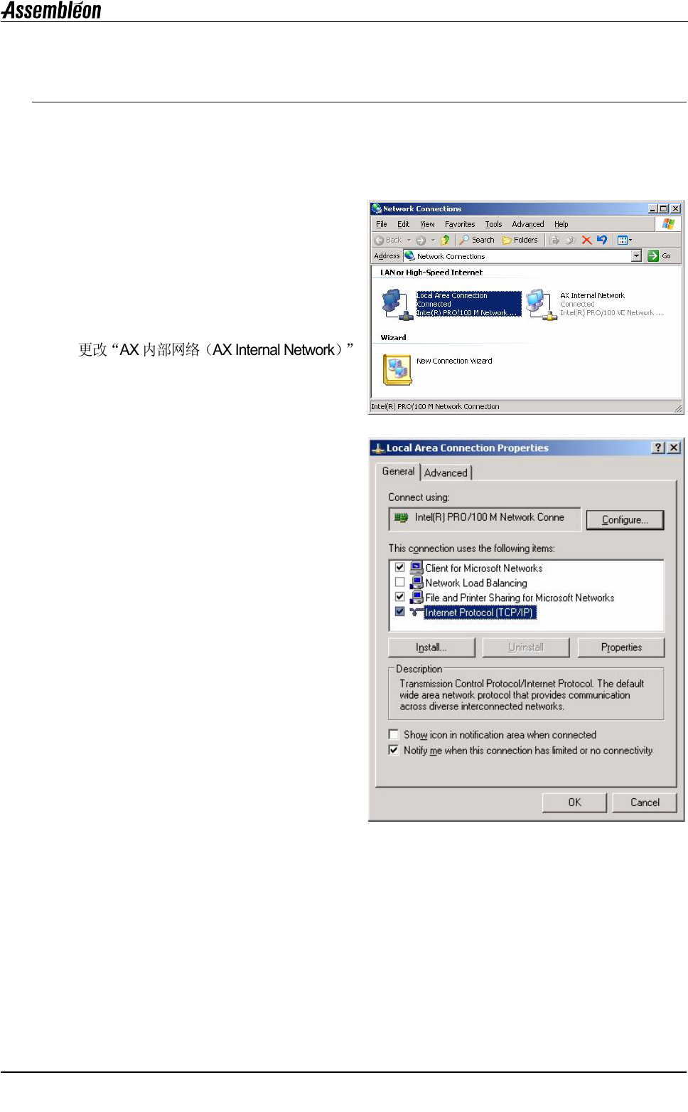 第 5 章 安装手册 4022 593 52152 52 AX-301/501 , AX-3/5 08.02 ch05.fm • 输入正确的用户网络 IP 地址、子网 掩码和初 始网关 (如果机器连接 至远程网络) (如 使 用 DHCP ,请 选 择 “自 动 获 取 IP 地 址 ( Obtain an IP address automatically ) ” 。 ) • 选择确定 ( OK ) ,接受更改。 3. 连接 LAN 以…