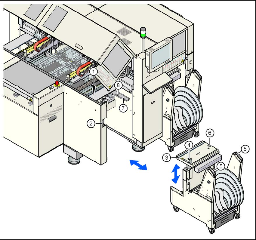 → 小心地将料车完全推入贴片机,直至挡杆处。