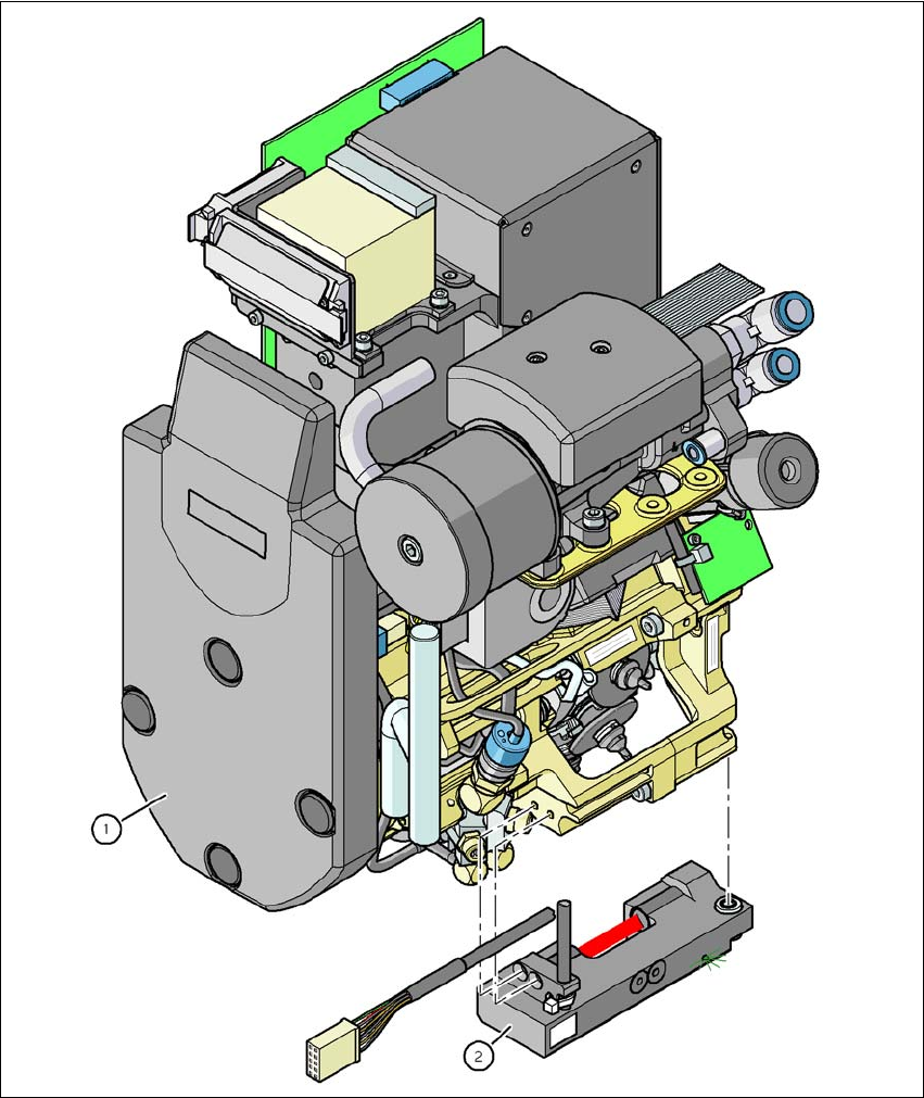 6 贴片机扩展部件 用户手册 SIPLACE D4i 6.8 C&P12 贴片头元件传感器 源自软件版本 SR.605.03 SP2 2012 年 10 月 中文版 234 6.8 C&P12 贴片头元件传感器 部件号 001 18021 -xx 12 吸嘴收集贴 片头的元件传感器 6 图 6.8 - 1 带元件传感器的 12 吸嘴收集贴片头 (1) 12 吸嘴收集贴片头 (2) 元件传感器