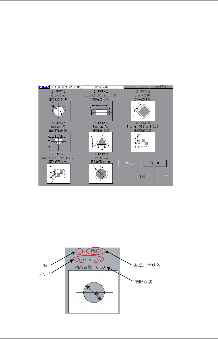 第 3 章 編輯器 第 3 部 XP-142E 系統手冊 3-3-18 Edition 1.0 · [ 基準定位點編輯畫面 ] 鍵 移 向基準定位點編輯畫面。 < 基板 ID 編輯 範圍 > · [ 定位點 名 ] 文本框 輸入定位點 名 。 ( 最 多可輸入 23 個位 元 組 ) · [>>] 鍵 顯示下一塊基板的 ID 資 訊 。 · [<<] 鍵 顯示前一塊基板的 ID 資 訊 。 · [No…