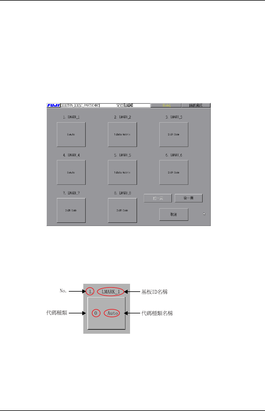 第 3 章 編輯器 第 3 部 XP-142E 系統手冊 3-3-20 Edition 1.0 · [ 取 消 ] 鍵 關 閉本 畫面。 · [ 前 頁 ] 鍵 /[ 次 頁 ] 鍵 切換頁 面。定位點數據可在 1 個畫面 裏 顯示時,不顯示 該 鍵畫面。 3.5.2 基板 ID 一 覽 表畫面 本 畫面顯示 現 在正在編輯的基板 ID 一 覽 表畫面。 XP2S2231T · 顯示編輯中的基板 ID 。 顯示基板 ID 名 、 代 碼…