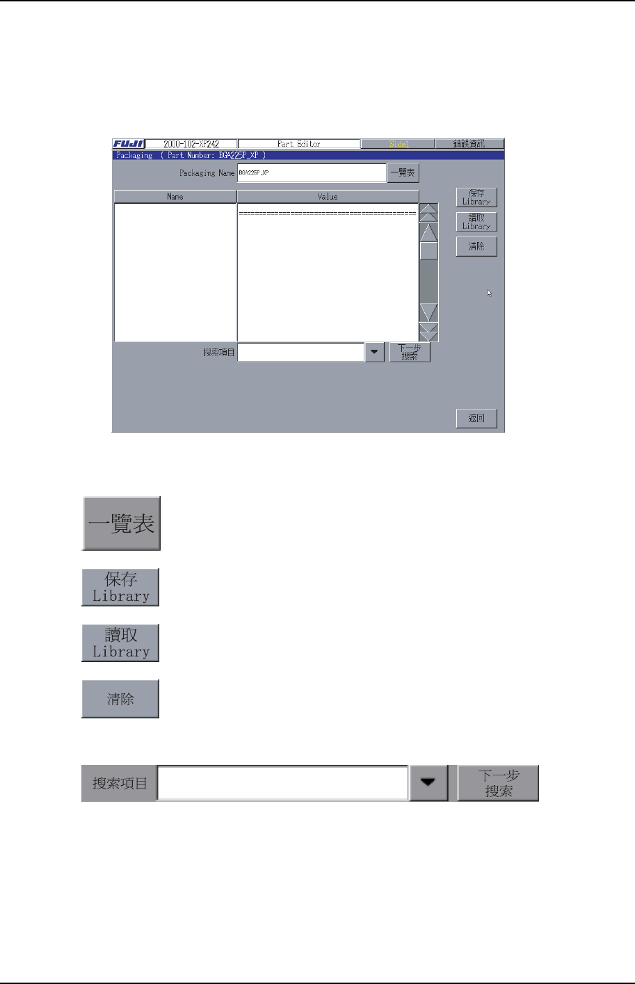 第 3 章 編輯器 第 3 部 XP-142E 系統手冊 3-3-36 Edition 1.0 ■ Packaging 編輯 Packaging 編輯是設定供料器、料盤等零件供應 媒 體 的編輯器。 XP2S2184T 操作鍵說明 專案 檢查 是 搜索 並顯示指定的資料 名 稱。 選擇 黑色 下 拉 鍵顯示分類 目錄 , 也可以直接從 鍵盤輸入資料 名 稱 來搜索 。選擇 [ 下一 步搜索 ] 鍵以從上 至 下的方向進行 搜索 。 顯示…