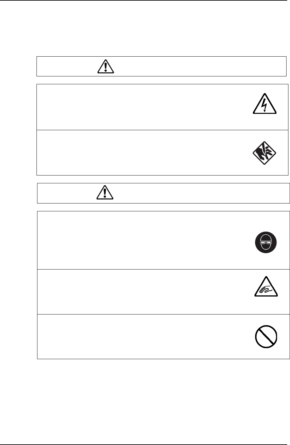 安全指南 XP-142E 系統 手冊 8E d i t i o n 1 . 0 3. 本機型 特 有的注意事項 XP-1 系 列 危險 不要 把 手 放 到 頻閃燈 和 頻閃燈 電 源 部 附 近。 ! 頻閃燈附 近或 頻閃燈 電 源 部 附 近有 高 電 壓 。 隨 便 把 手 或 螺絲刀插 入到 裏面 , 很 有可能觸電 , 極 其危險。 觸電注意 不要 把 手或身體 放 入 廢料帶切刀 處。 ! 在 廢料帶切刀 上 帶 有 刀刃 …