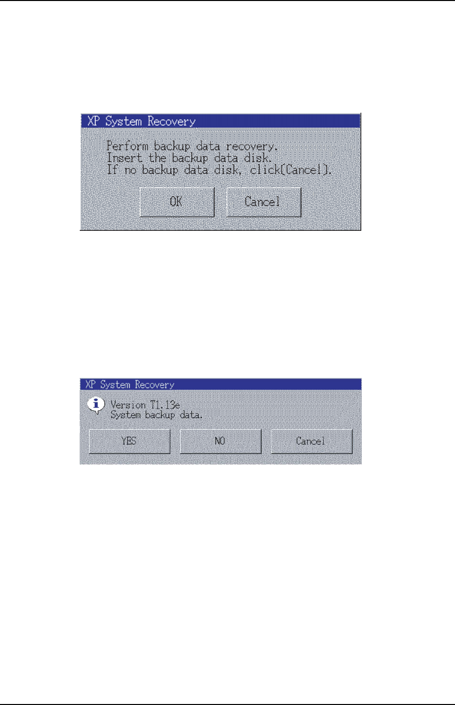 第 8 部第 3 章 用復位盤進行系統復位 Edition 1.0 8-3-7 XP-142E 系統手冊 3.4 複製 啟動 參 數 啟動 參 數的內容不正 常 時, 不能啟動 XP 機器, 所以必須設定啟動 參 數。 在 這個 步驟中, 用 默認 設定 複製 啟動 參 數,以使 XP 機器能 夠 啟動。 用戶備份資料的恢復 結束 後,顯示是 否複製 啟動 參 數的對 話框 。 XP2S2416 按 [OK] 鍵後, 複製 啟動 參 數…
