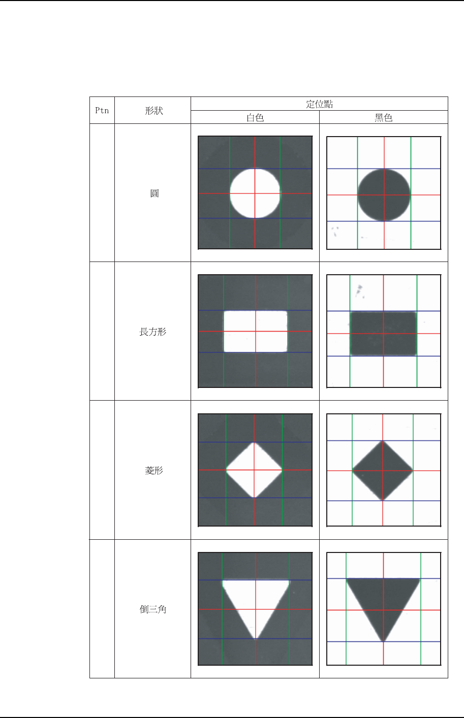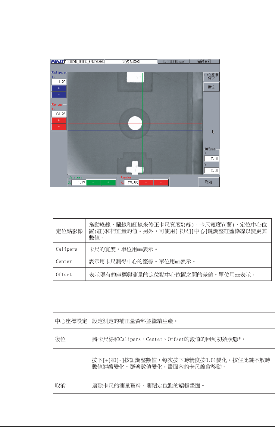 使用滑鼠拖動卡尺線,與定位點的外形相吻合設定中心。下面說明各種定位點與卡尺線