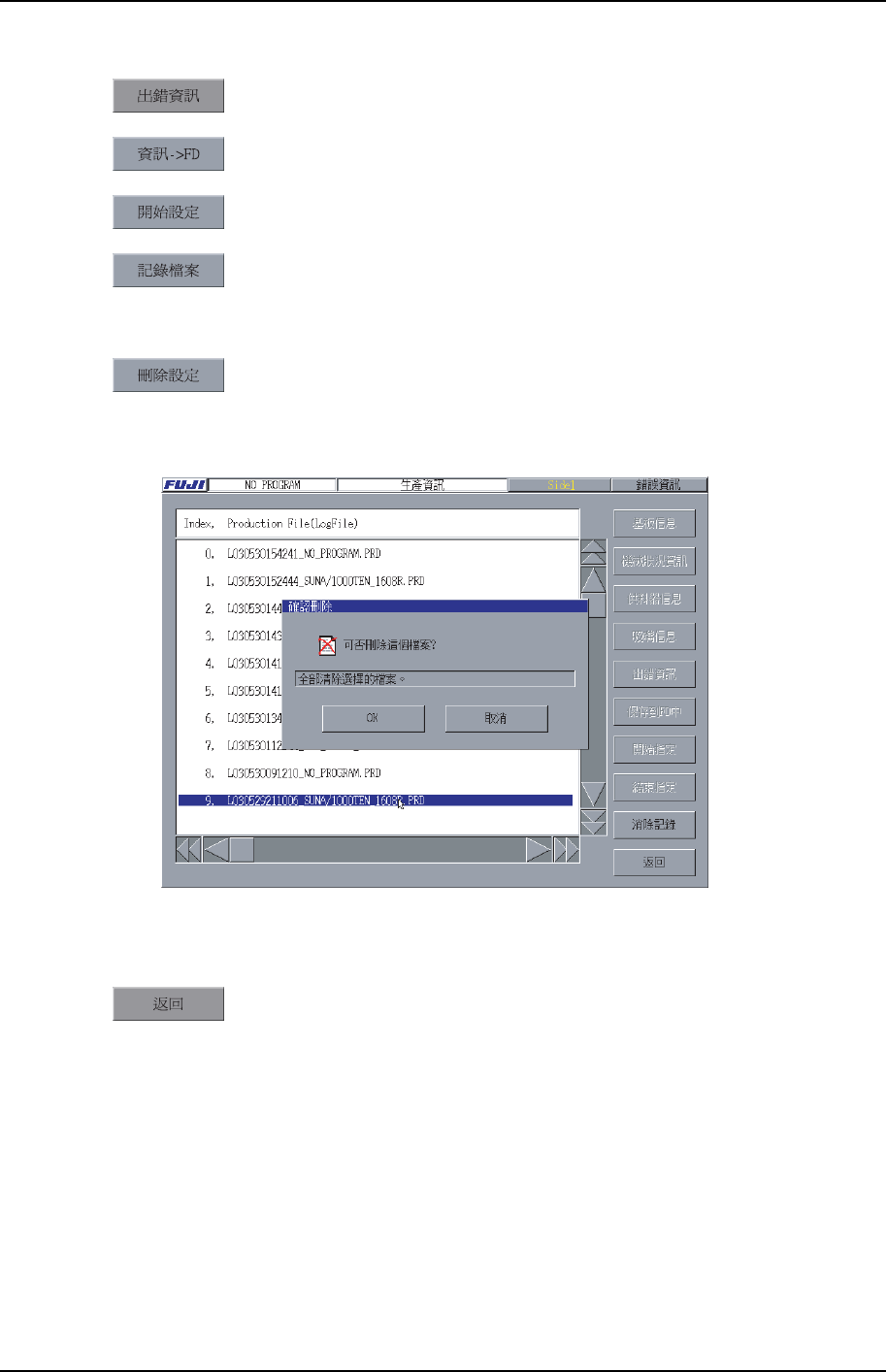 第 3 章 生產資訊的顯示功能 第 2 部 XP-142E 系統手冊 2-3-6 Edition 1.0 3.2.3. 記錄檔案選擇畫面 XP1S2071T 資料說明 保存在當前 /sd0/FUJI/USER/PRODUCT 中的記錄檔案全部顯示在此畫面上。 使用 [ 開始指定 ] 和 [ 結束指定 ] , 選擇將要處理的記錄檔案, 然後選擇 [ 保存到 FD 中 ] 按鍵、 [ 基板資訊 ] 按鍵、 [ 機器狀態資訊 ] 按鍵 、 […