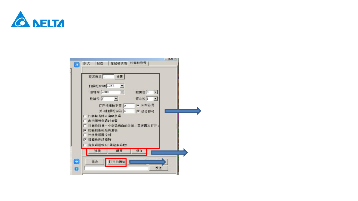 Delta Confidential 架設方法 掃描槍設置 2. 在 AOI 操作菜單上選擇”其他“ ”測試程序“ ”掃描槍設置“ , 按下圖面板所示進行設置 , : 1. 按如圖所示設置 2. 點擊鏈接后保存 3. 打開掃描槍 6