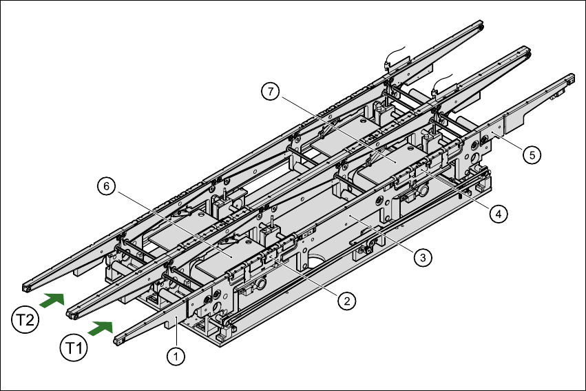(7) Lifting table, processing area 2 T1 Transport track 1