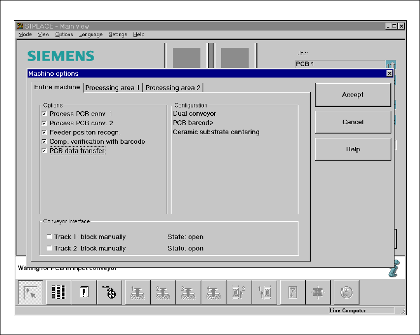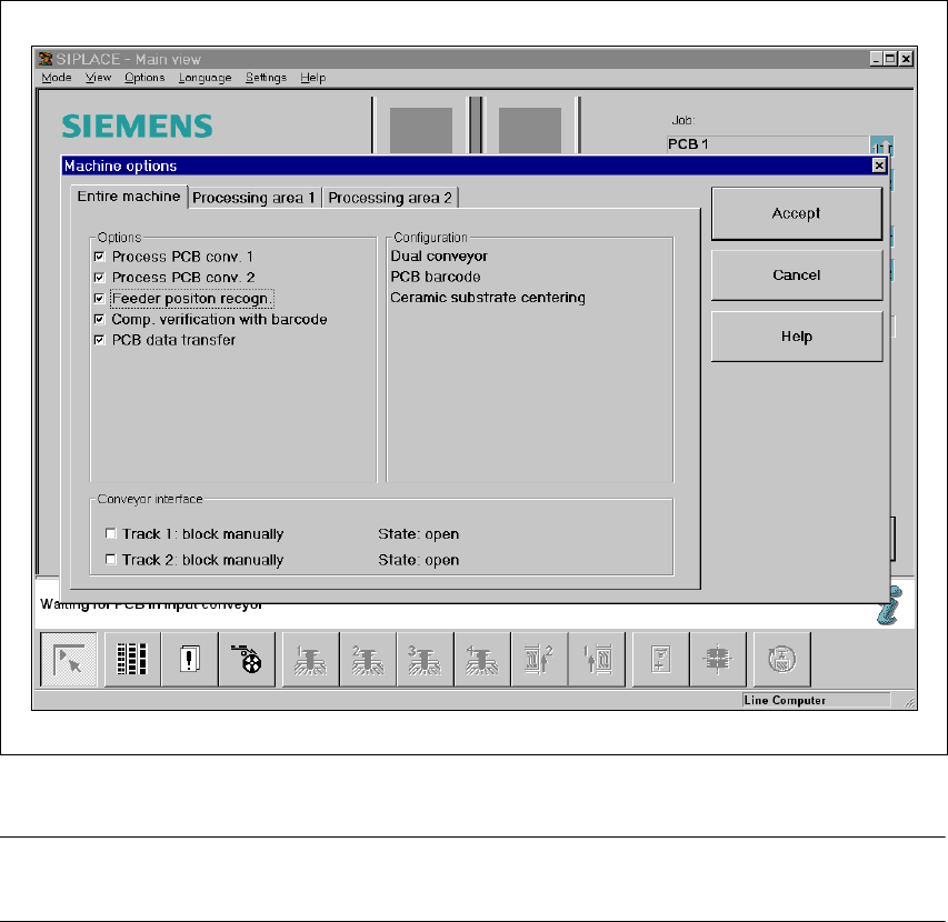 User Manual SIPLACE HS-50 5 Station extensions Software Vers ion SR.50x.xx 01/2006 US Edition 5.6 PCB dat a transfer 169 Æ Clic k on the ’ Machine options’ but ton in t he basic v iew . The ’Ma chine op tions’ wi ndow op…