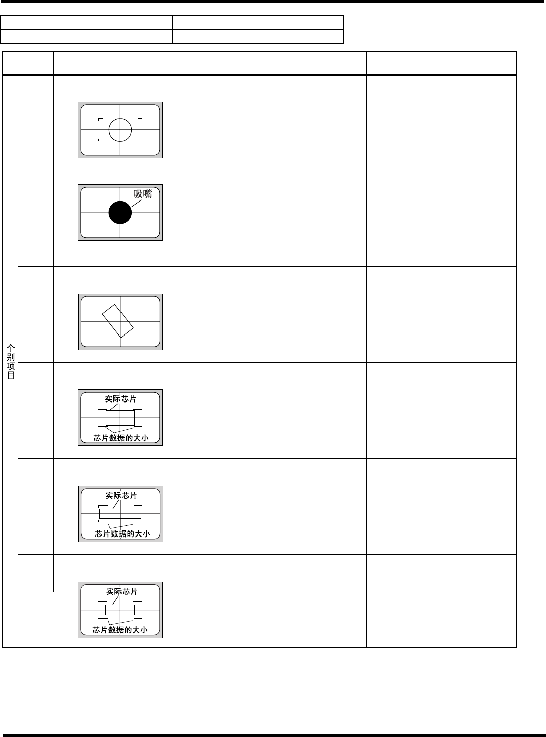 HGR40 附录 1.4 轮廓识别错误信 息 附录 1-90 参考 No. 形状编号 类别 51 ~ 56, 88, 89, 157 1a, 1d 固定电阻、电容器 等 1/2 代码 内容 原因 对策 1) 吸着错误·吸着异常 ( 错误画面上只看见吸嘴的 轮廓 ) 请确认部品高度、 吸着位置、 吸着 偏移量、 使用 吸嘴, 使吸着 状态更 趋稳定。 2) 参照编号错误 请确认芯片数据。 20 (20) 特征点数在规定外 < 错误画…