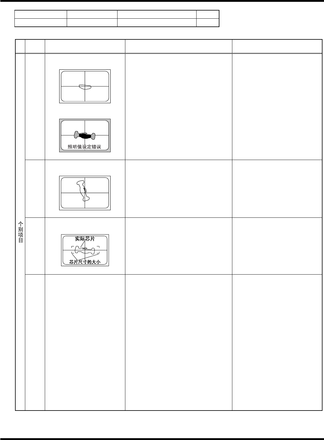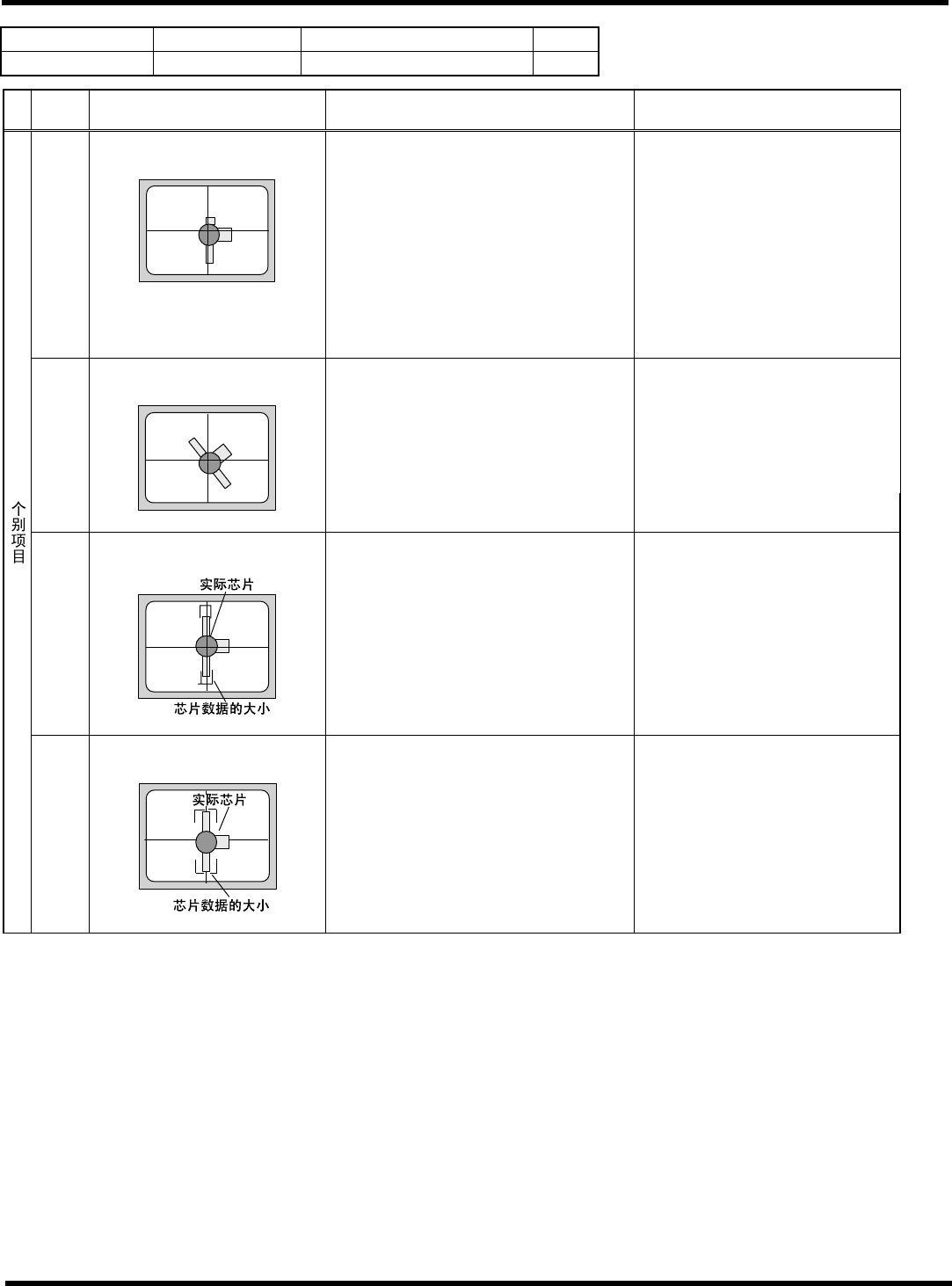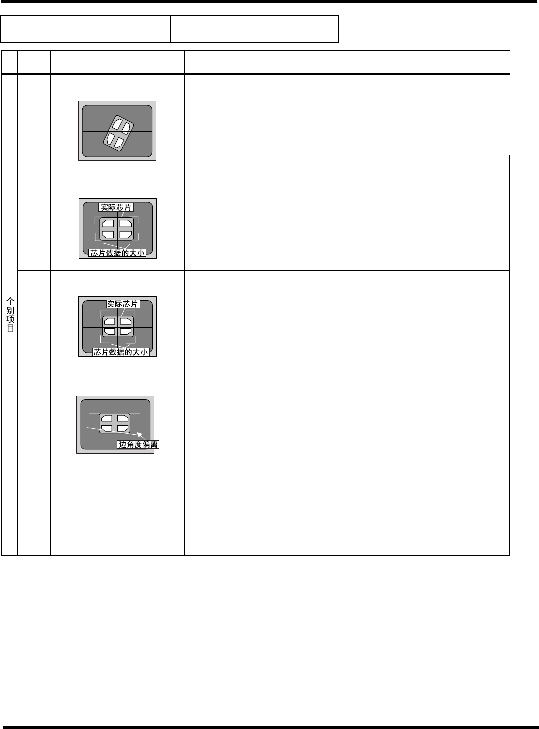 HGR40 附录 1.4 轮廓识别错误信 息 附录 1-101 参考 No. 形状编号 类别 77 ~ 79 5a 玻璃管二极管 等 1/1 ∗ 以下图的式样为 ± 90 ° 。 代码 内容 原因 对策 1) 吸着错误、吸着异常 ( 错误画面上只看见吸嘴的 轮廓 ) 请确认吸着状态。 ( 确认芯片数据、高度检测 系统 ) 2) 参考编号错误 请确认芯片数据的参考 编号。 ( 芯片数据 ) 20 (20) 特征点数在规定外 < 错误…