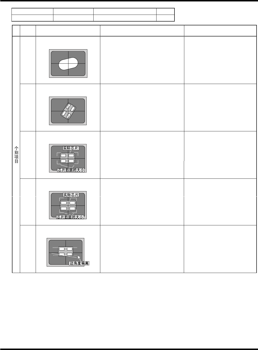 HGR40 附录 1.4 轮廓识别错误信 息 附录 1-103 参考 No. 形状编号 类别 81 5k 过滤器 、 HIC 等 1/1 代码 内容 原因 对策 1) 部品的角部不是锐角 请确认对象部品。 20 (20) 部品角部位置检测异常 < 错误画面 > 21 (15) 识别角度异常 < 错误画面 > 1) 识别角度超出容许范围 ± 30 ° 以上 请确认部品高度、 吸着位置、 吸着 偏移量、 使用吸嘴,使…