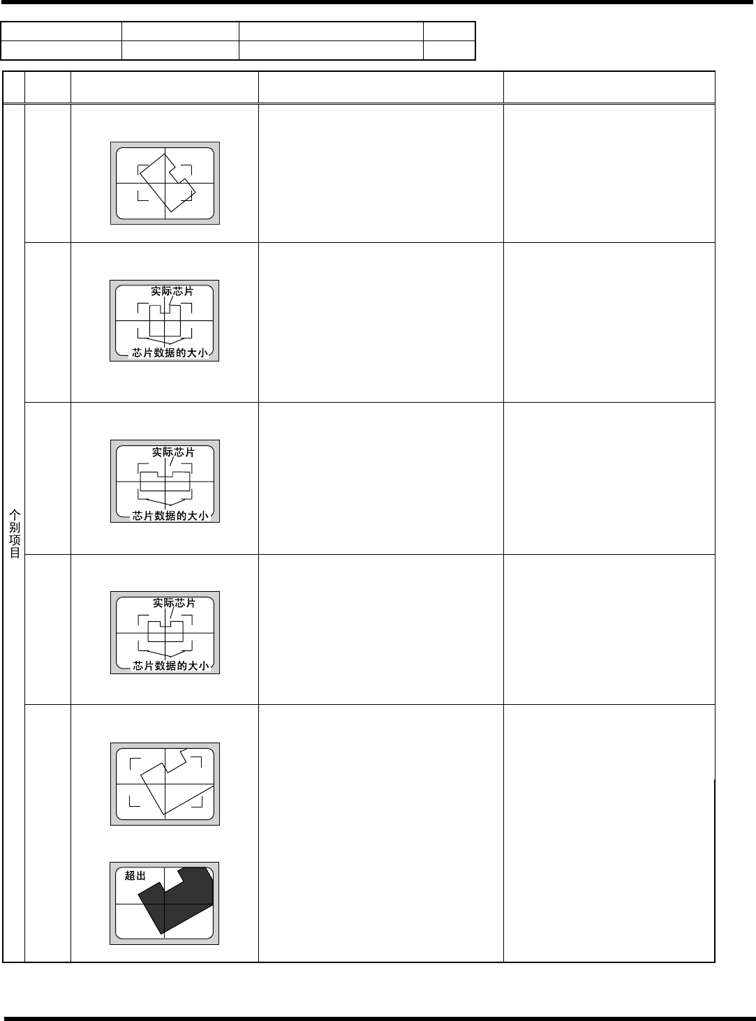 HGR40 附录 1.4 轮廓识别错误信 息 附录 1-108 参考 No. 形状编号 类别 101 1h 板弹簧、壳 等 1/1 代码 内容 原因 对策 1) 识别角度超出容许范围 长方形部品 : ± 60 ° 以上 正方形部品 : ± 30 ° 以上 请确认部品高度、 吸着位置、 吸着 偏移量、 使用吸嘴,使吸着状态更 趋稳定。 21 43 (15) (25) 识别角度异常 < 错误画面 > 请确认式样角度。 ( 配置数…