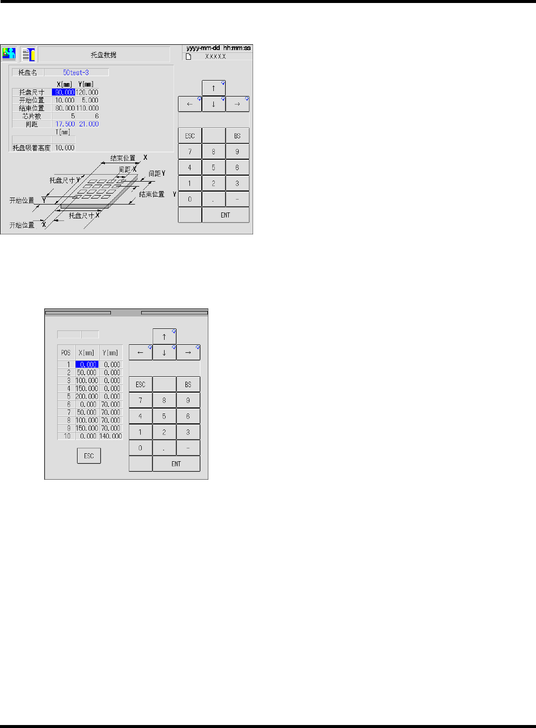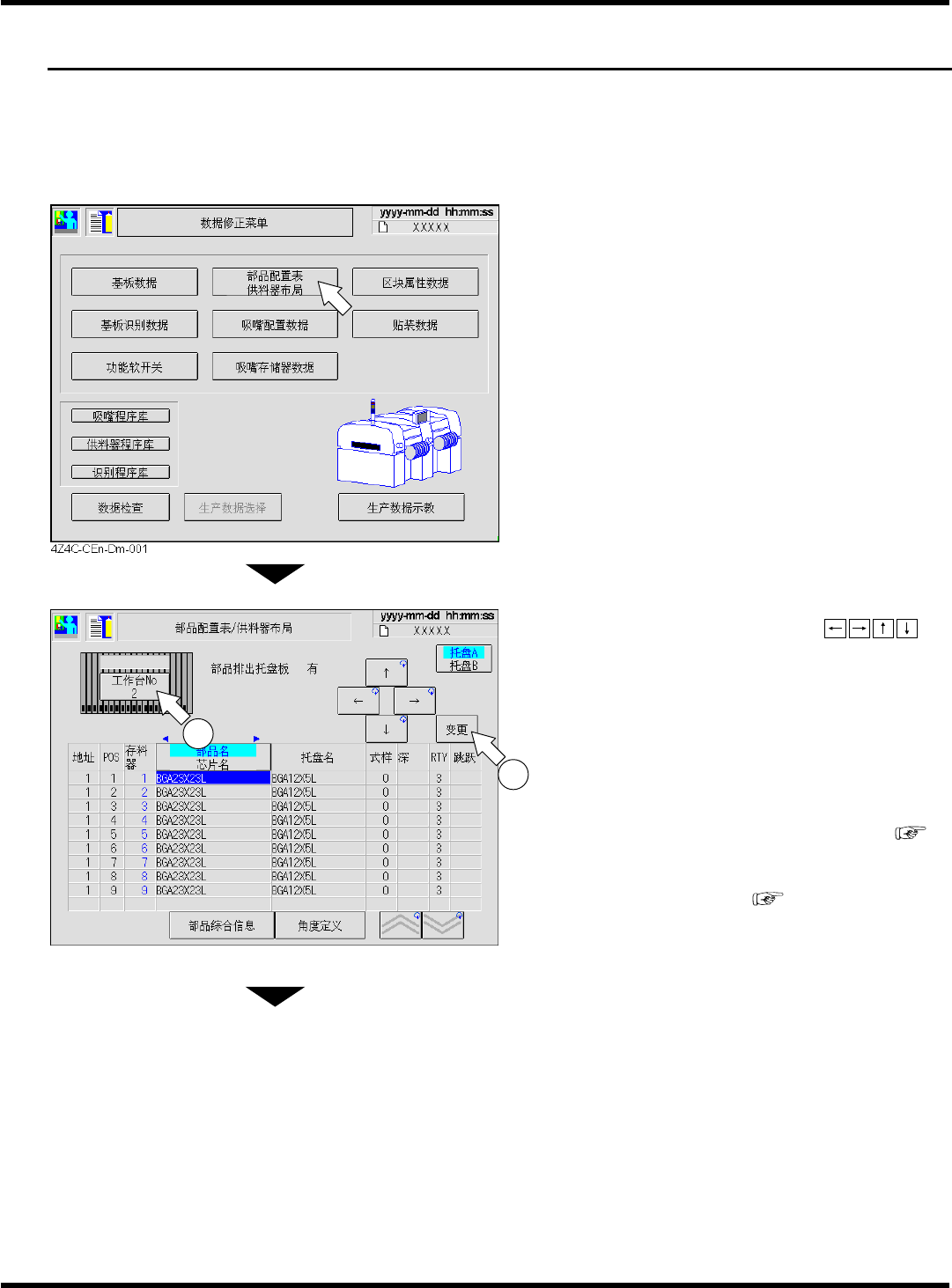 CM101-D 程序手册 1.5 托盘数据 ( 选购件 ) Pa ge 1- 11 1.5 托盘数据 ( 选购件 ) 进行托盘数据的确认。 ∗ 是用手放托盘供料器的 说明。 关于直接托盘供料器, 请参照 DT50S-20 的使用说明书 。 1. 按下 [ 部品配置表 / 供料器布局 ] 。 2. 已选择供料器工作台后,用 将光标移到想要变更的栏,按下 [ 変更 ] 。 • 只能修正 POS 、芯 片 数 据 ( 元件名 / 芯片名 ) …
