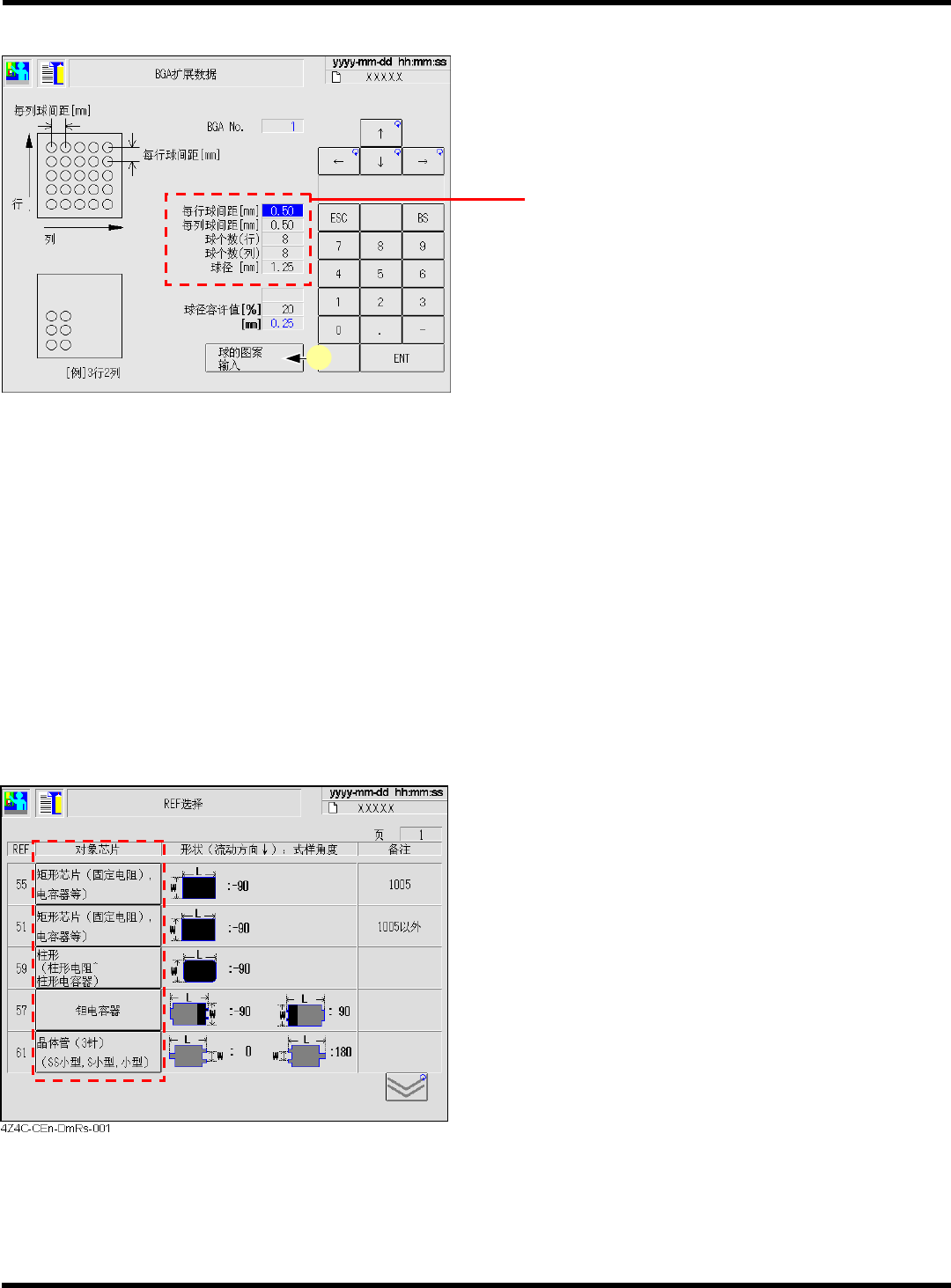CM101-D 程序手册 1.6 芯片数据 Pa ge 1- 15 1.6.1 扩展芯片数据 按 [ 扩张芯片 ] ,可对芯片的 引线信息进行确认和修正。 ① 包括边的说明图在 内的每边的引线 间距、引线数数据 ② 每边的引线缺数据 a. [ 引线缺 ] 选择要显示引线缺数据 的一边。 ( 每按一次,按 1 → 2 → 3 → 4 → 1 切换 ) b. [ 引线缺输入 ] 指定显示的边之引线编 号,交替设定引线有和引线 缺。 c. […