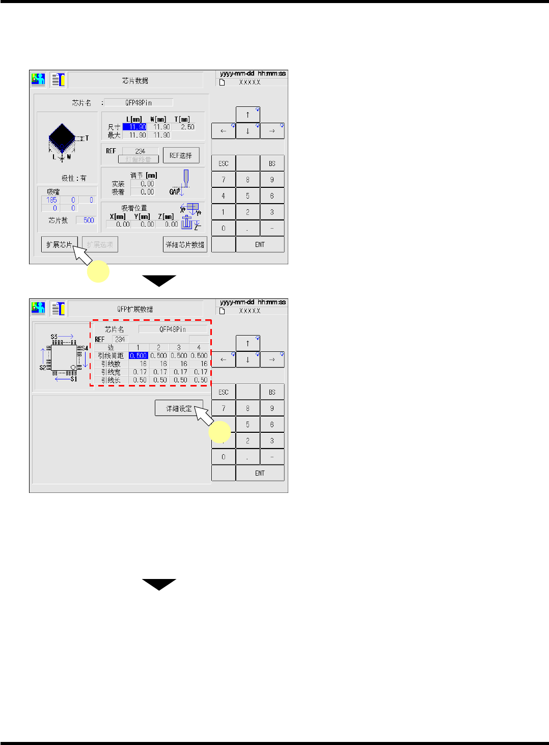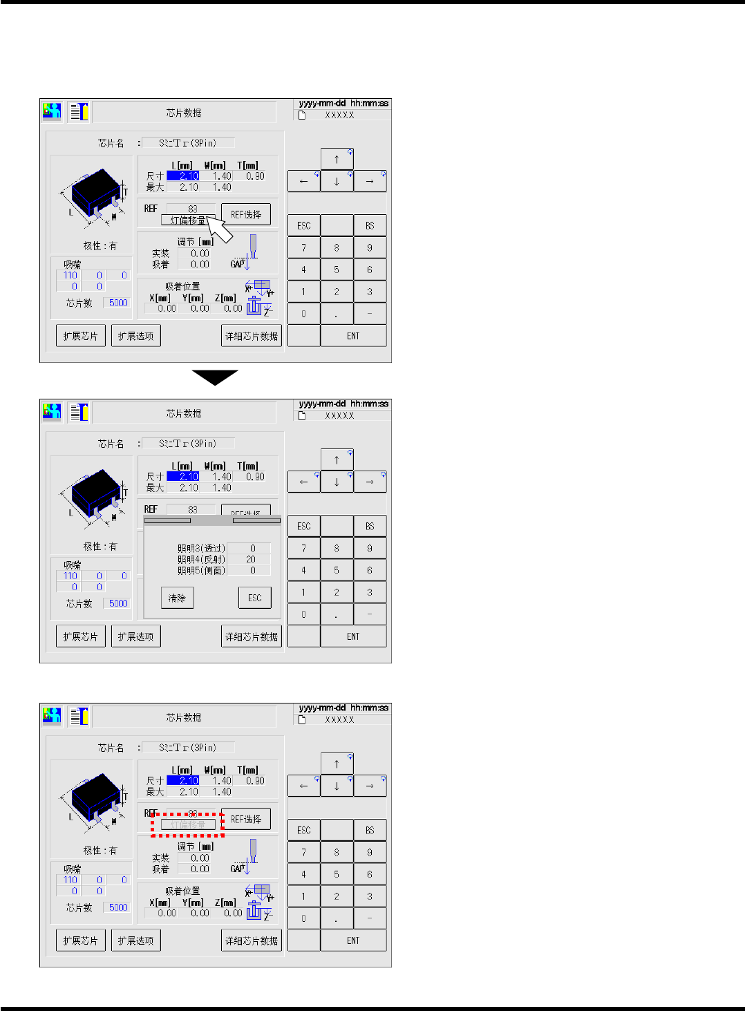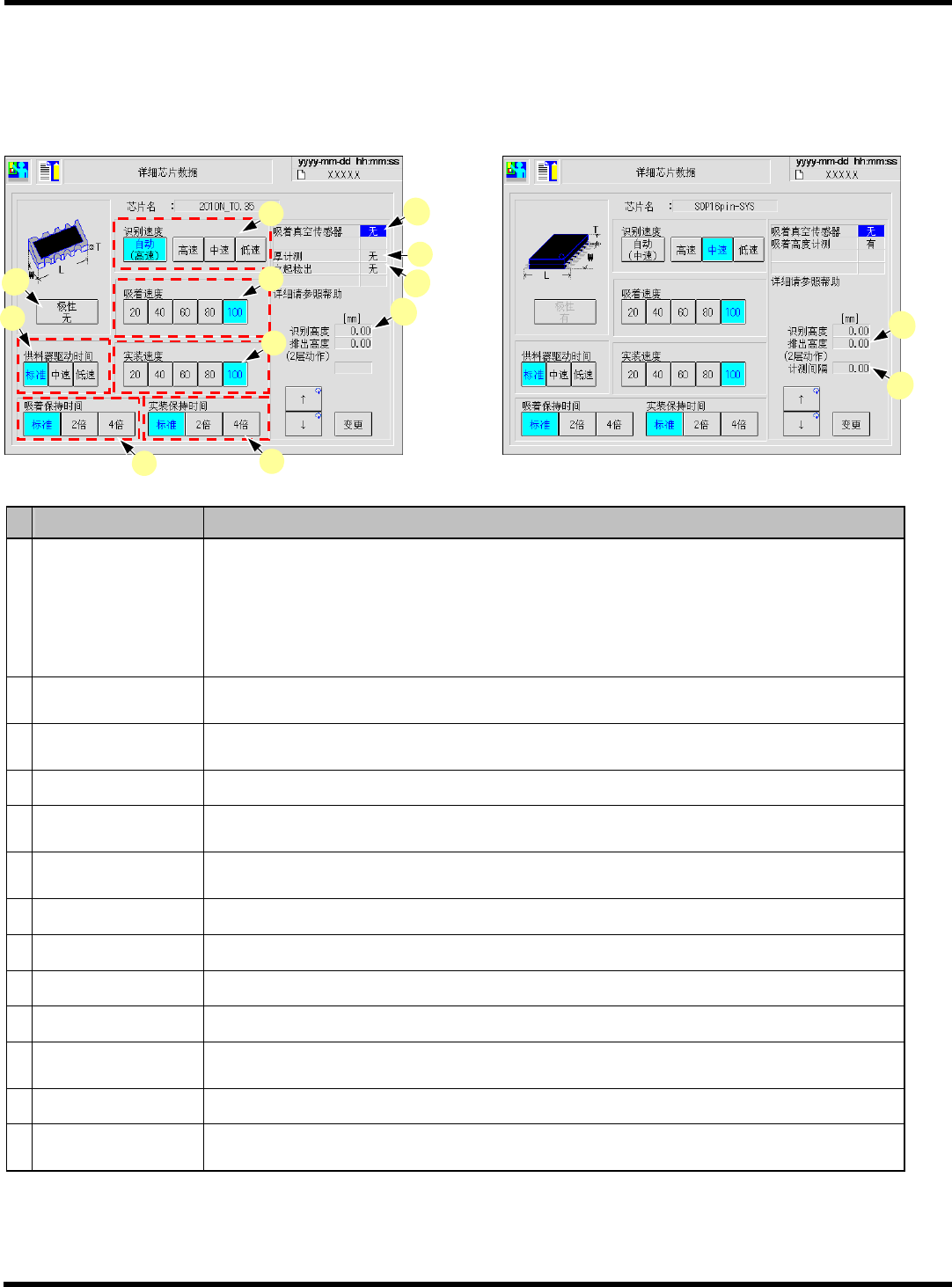 CM101-D 程序手册 1.6 芯片数据 Pa ge 1- 18 1.6.4 详细芯片数据 按 [ 详细芯片数据 ] ,在芯片数据详细 信息中可设定识别速度、吸 着保持时间、实装保持时间 。 < 高速吸头 (12 吸嘴 ) 、通用吸头 (8 吸嘴 )> < 多功能吸头 (3 吸嘴 )> 菜单 内容 a ‘ 识别速度 ’ 选择芯片识别的扫描速 度。 [ 自动 ] : 根据芯片尺寸、 REF 、吸嘴种类等,自动选 …