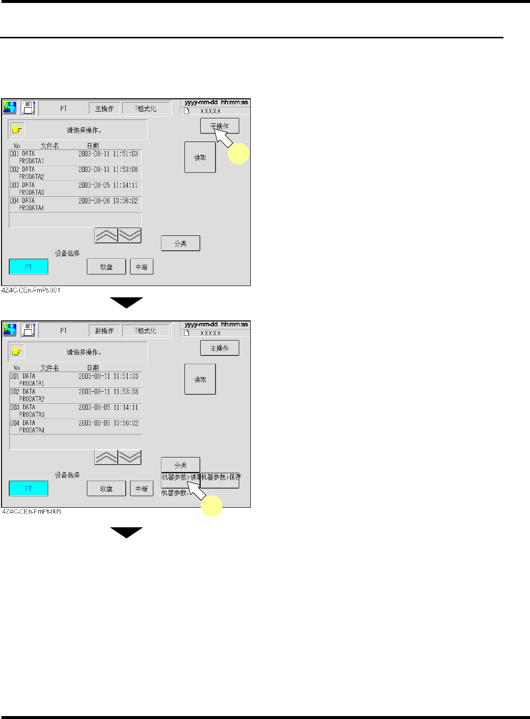 CM101-D 程序手册 2.3 机器参数的读取 / 保存 Page 2-5 3. 按 [ 是 ] 。 ∗ 将显示 “ 也要读取系统参数 吗 ?” 。 平常 , 请按 [ 否 ] 。 ∗ 设置选购件等的情况下 , 若需读取系 统参数时, 请按 [ 是 ] 。 • 读取系统参数后,机器 构成信息有可能发生变 更。 • 显示 “ 数据读取中… ” 的信息, 此时机器当中的机 器参数被读取。 ∗ 中止读取时,按 [ 否 ] 。 3 EJM5B…