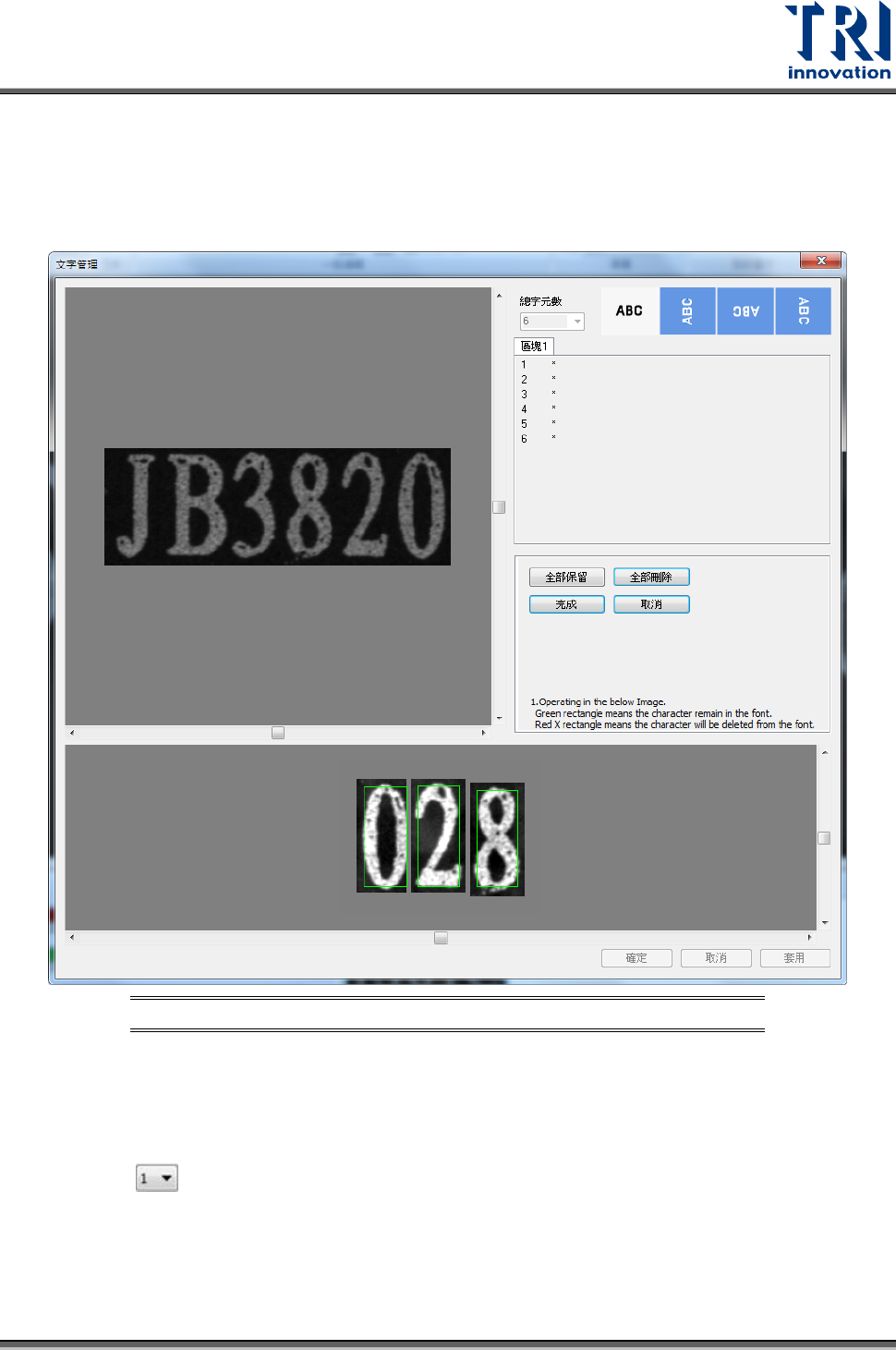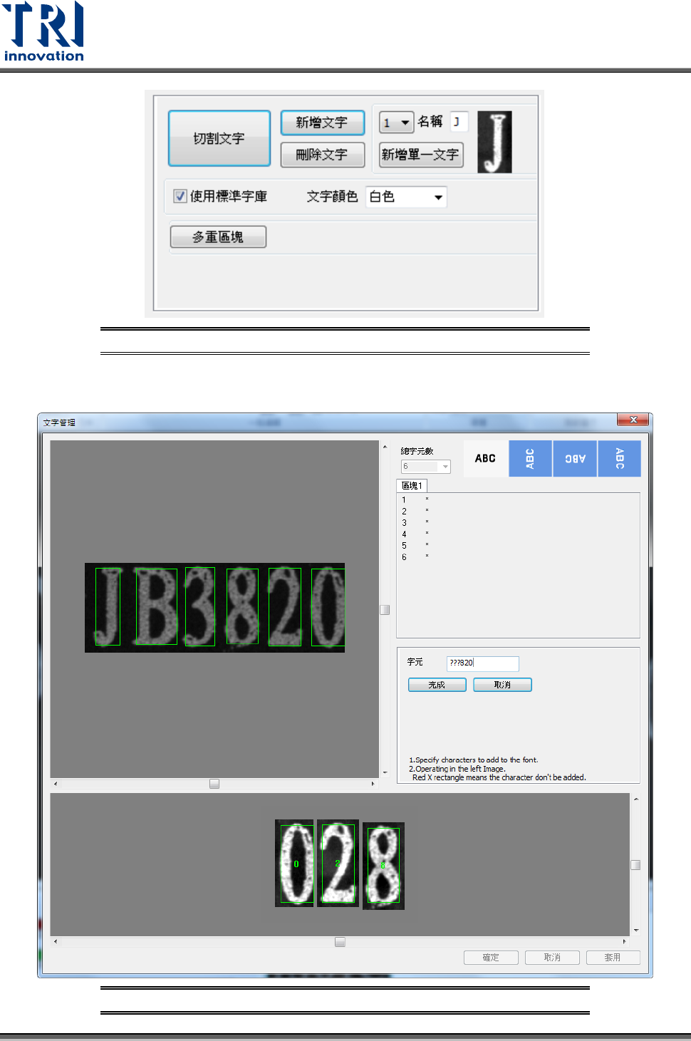 Test Research, Inc. 80 TR7500 SIII Series User G uide – Soft ware 圖 115 :文字管理 – 字元 切割區 - 切割文字:自動搜尋可 切割的字元區域。 - 新增文字:手動進行 多個 字元的切 割 並新 增動作, 點選後會出現如 下圖的介面。 圖 116 :文字管理 – 新增文字
