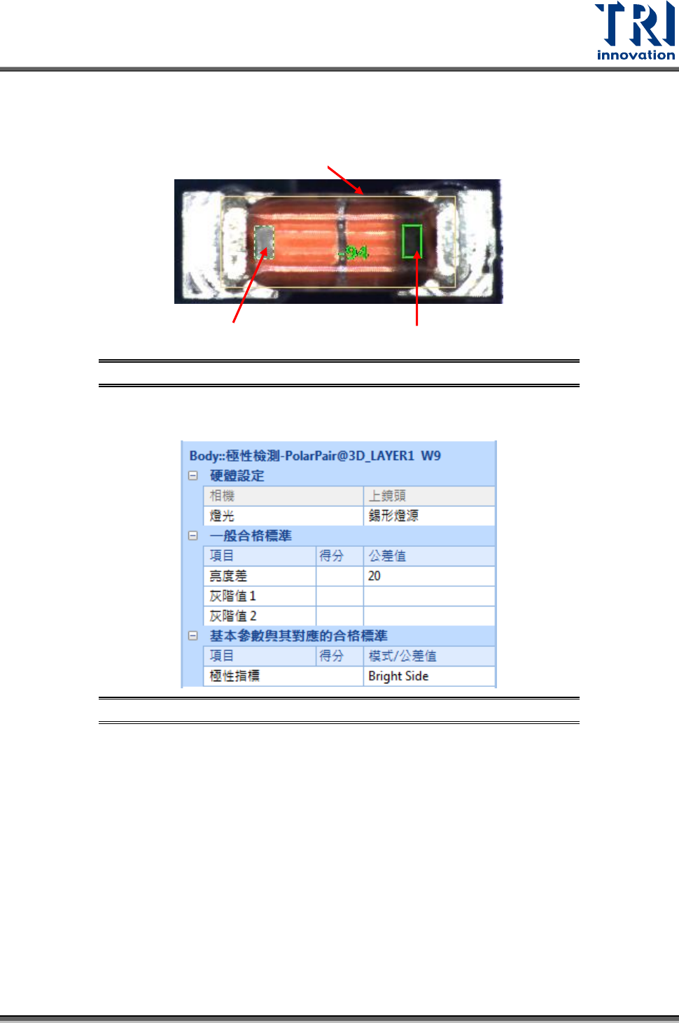 檢測原理:利用檢測框與對照框之間的灰階亮度差,來測試元件的極性。(對照框的位置會依