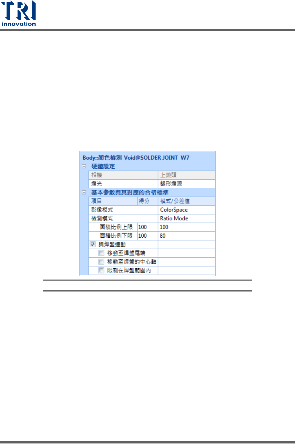 Test Research, Inc. 90 TR7500 SIII Series User G uide – Soft ware 3.7.16 顏色檢測 (Void) 框 Void 框可區分為三類,分別為 Ratio M ode 、 Blob Mode 、 Sim mode 。 Ratio Mode : 用途:利用比例來檢查 元件的錫點空焊、缺件或極 反。 檢測原理: 1. 灰階模式 :計算亮或 暗區占整個檢測 框的比例。 2. …