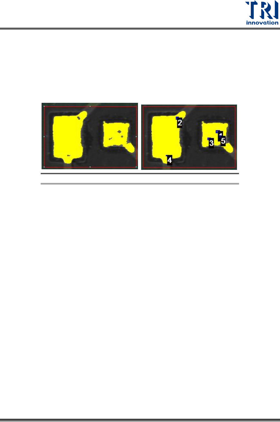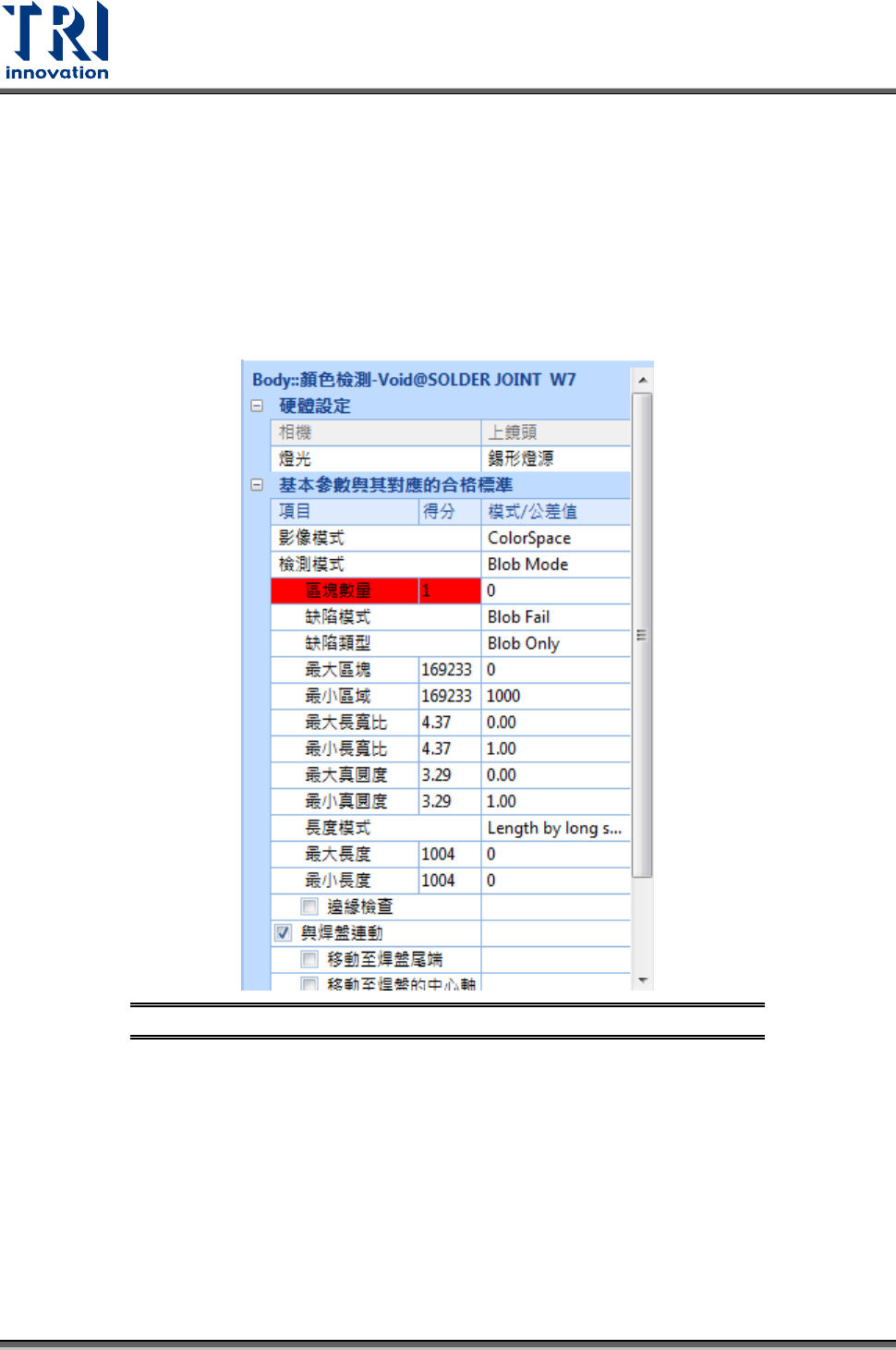 Test Research, Inc. 92 TR7500 SIII Series User G uide – Soft ware Blob Mode : 用途: 利用 區塊數量 來檢查 用來檢測金手指表面刮 傷、髒污與積體電路 翹腳 。 檢測原理: 1. 灰階模式 :計算亮或 暗區占整個檢測 框的比例。 2. 色彩模式:計算所選 取的色彩占 全部檢測框的比 例。 參數畫面與說明: 圖 132 : Void 框參 數設定畫面 – B…