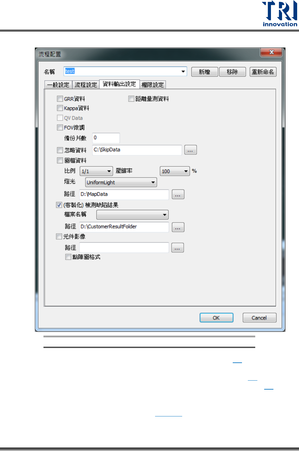 Test Research, Inc. 120 TR7500 SIII Series Us er Guide – Sof tware 壓縮率:設定輸出全板 圖檔的壓縮 比例。壓縮比 例越低,圖檔越小 。 燈光:設定輸出在指定光 源下的全板圖檔。 路徑:設定輸出全板圖 檔的輸出路徑。 ( 客製化 ) 檢測缺陷 結果:此功能為合併前後機台 的測試結果 。詳細內容請參 閱 Fail Board 資訊 整合輸出 功能文件。 …