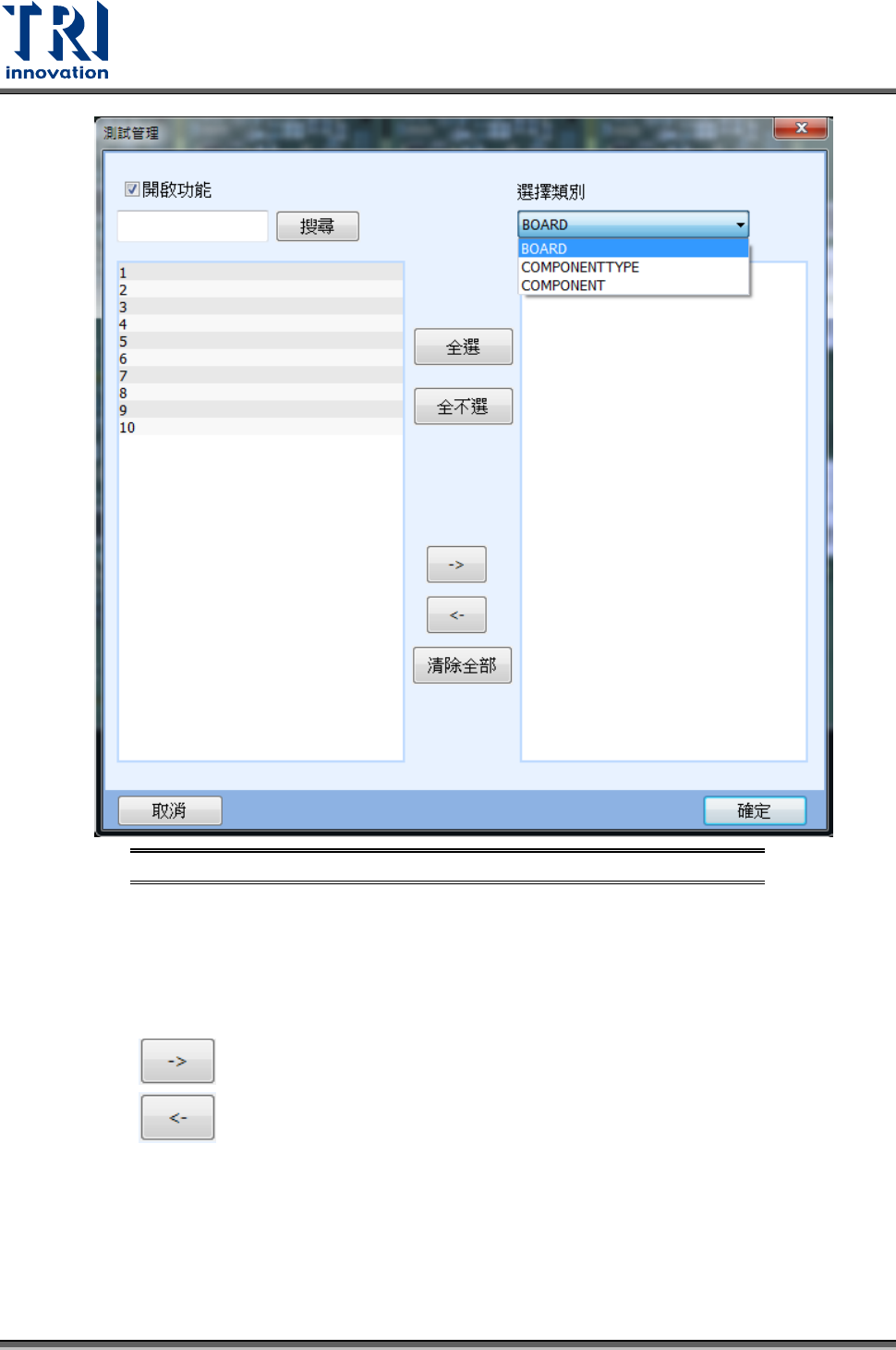 Test Research, Inc. 138 TR7500 SIII Series Us er Guide – Sof tware 圖 193 :測試管理 設定視窗 − 開啟功能:開啟此功能 測試。 − 搜尋:可搜尋元 件或類型。 − 選擇類別:可區 分為子板、類型、 元件設定。 − 全選:將左邊所 有條件選取。 − 全不選:將左邊 所有條件取消選取 。 − :將左邊所選取的移至 右邊當測試設定。 − :將右邊所選取的取消 測試設定。…