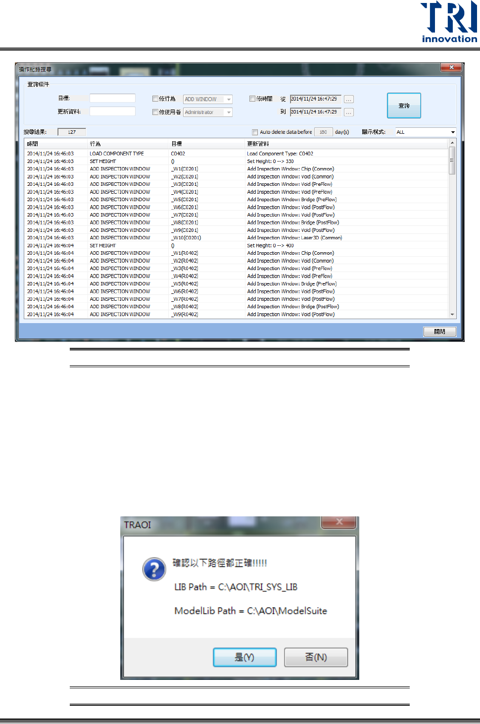 • 操作紀錄:提供使用者觀察該程式新增、刪除、修改檢測框參數與模式的紀錄。此紀