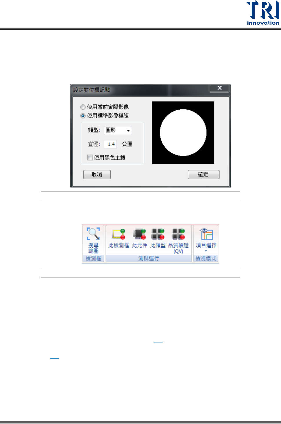 Test Research, Inc. 146 TR7500 SIII Series Us er Guide – Sof tware 圖 208 :新增對位 標記的檢視功能 − 搜尋範圍:顯示 搜尋範圍 。 − 處理後影像:顯 示經過影 像處理後的影像 。 5.3.8.2 壞板標記 在指定的位置新增壞板 標記檢測框 ( 僅可以用 Patmatch 、 Cor m a tch 來測試 ) 。當壞板 標記 檢測 不良時會忽略該板檢測。當拖曳…