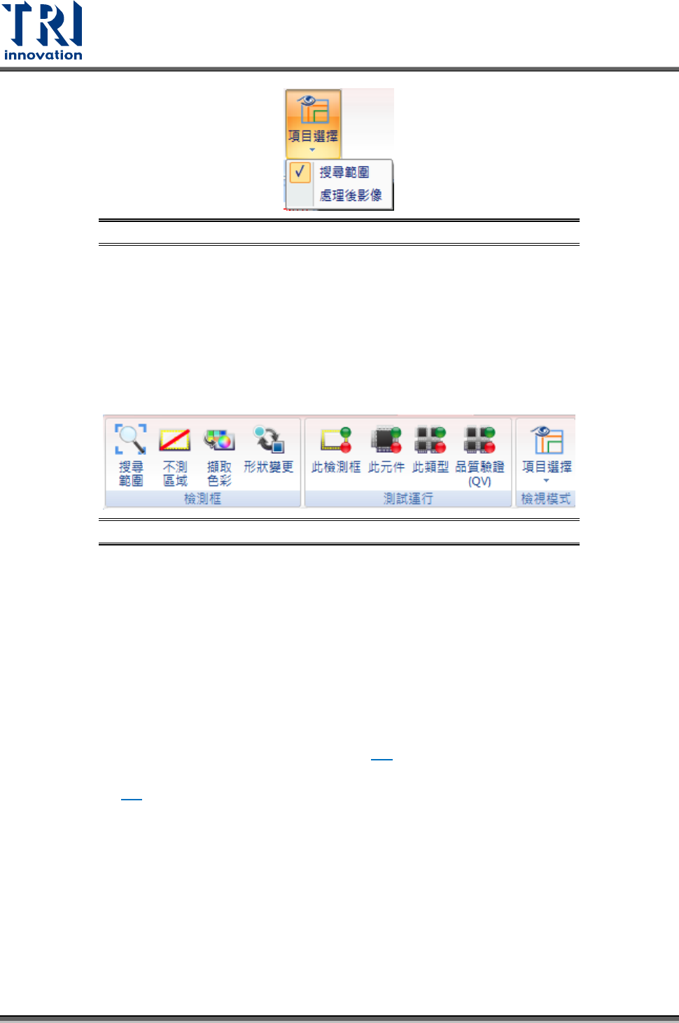 • 不測區域:測試已選擇檢設框所屬元件的所有檢測框。