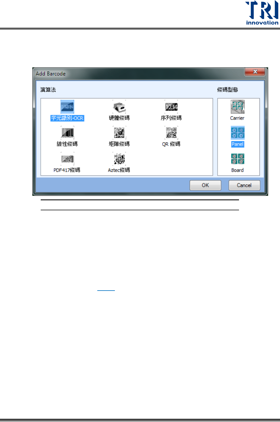 − 條碼型態:可區分為 Carrier、Panel、Board。Carrier 代表此條碼為貼在治