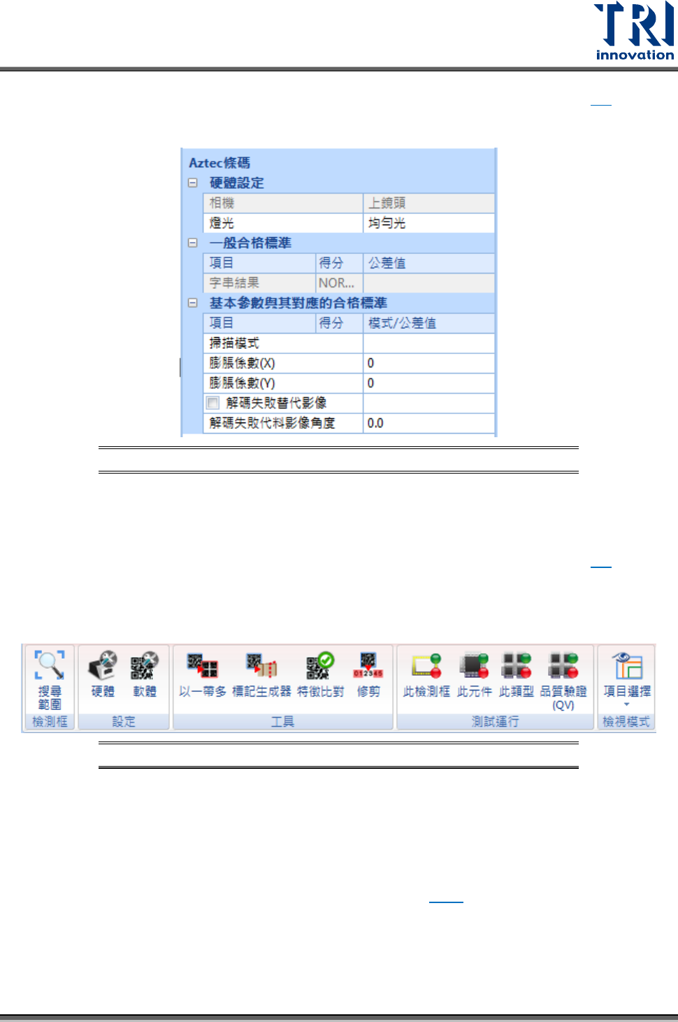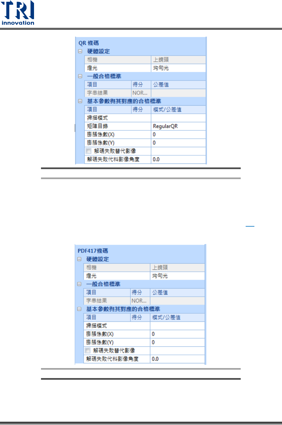 Test Research, Inc. 152 TR7500 SIII Series Us er Guide – Sof tware 圖 217 :條碼設定 視窗 – QR 條碼 − 掃描模式 :目前僅能使 用 RunTime 模式。 − M atr ix 目錄:分為 RegularQR 及 MicroQR 兩種。 − 膨脹係數 ( X ) :針對點狀 條碼列印,讓點 X 方向膨脹可以連成直線 。 − 膨脹係數 (Y ) :針對點狀 條…