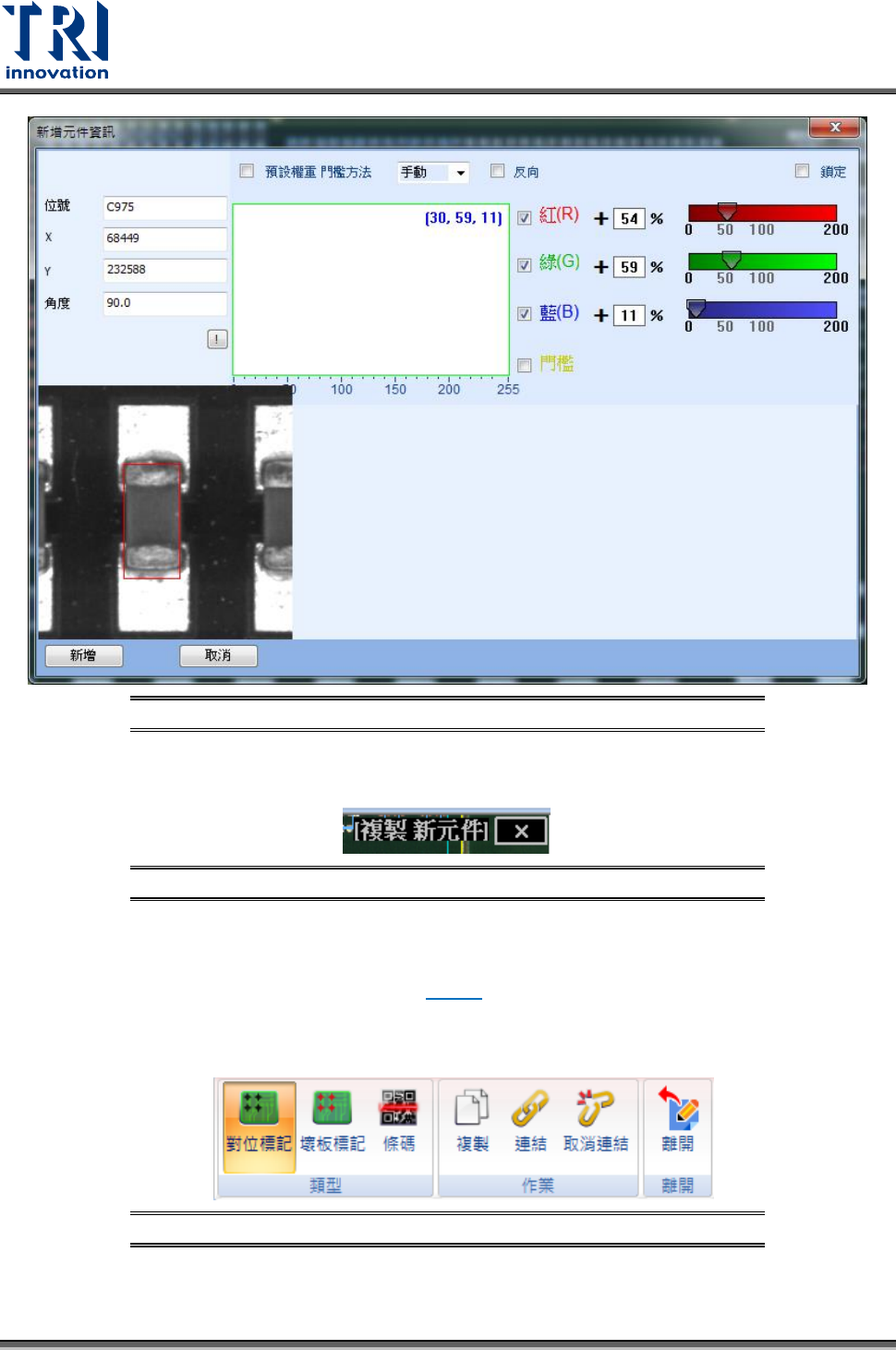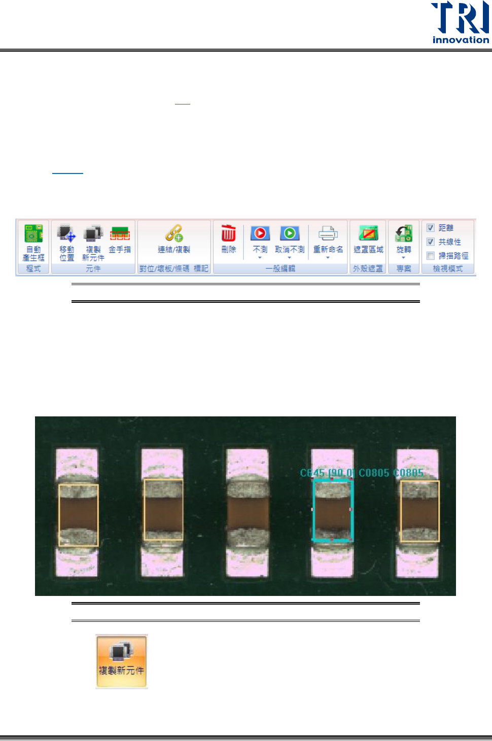 Test Research, Inc. 160 TR7500 SIII Series Us er Guide – Sof tware 圖 230 :複製新元 件 – 編輯元件資料 4) 確定位置正確後,按下 [ 新增 ] 。 5) 此時可重複新增元件, 如欲關閉 功能 請按 檢測板圖 區右上角的叉叉。 圖 231 :複製新元 件介面離開方式 • 金手指: 快速產生檢測金 手指所需要的檢測框。點 選功能後,直接 在電路板 上金手指 部分拉…