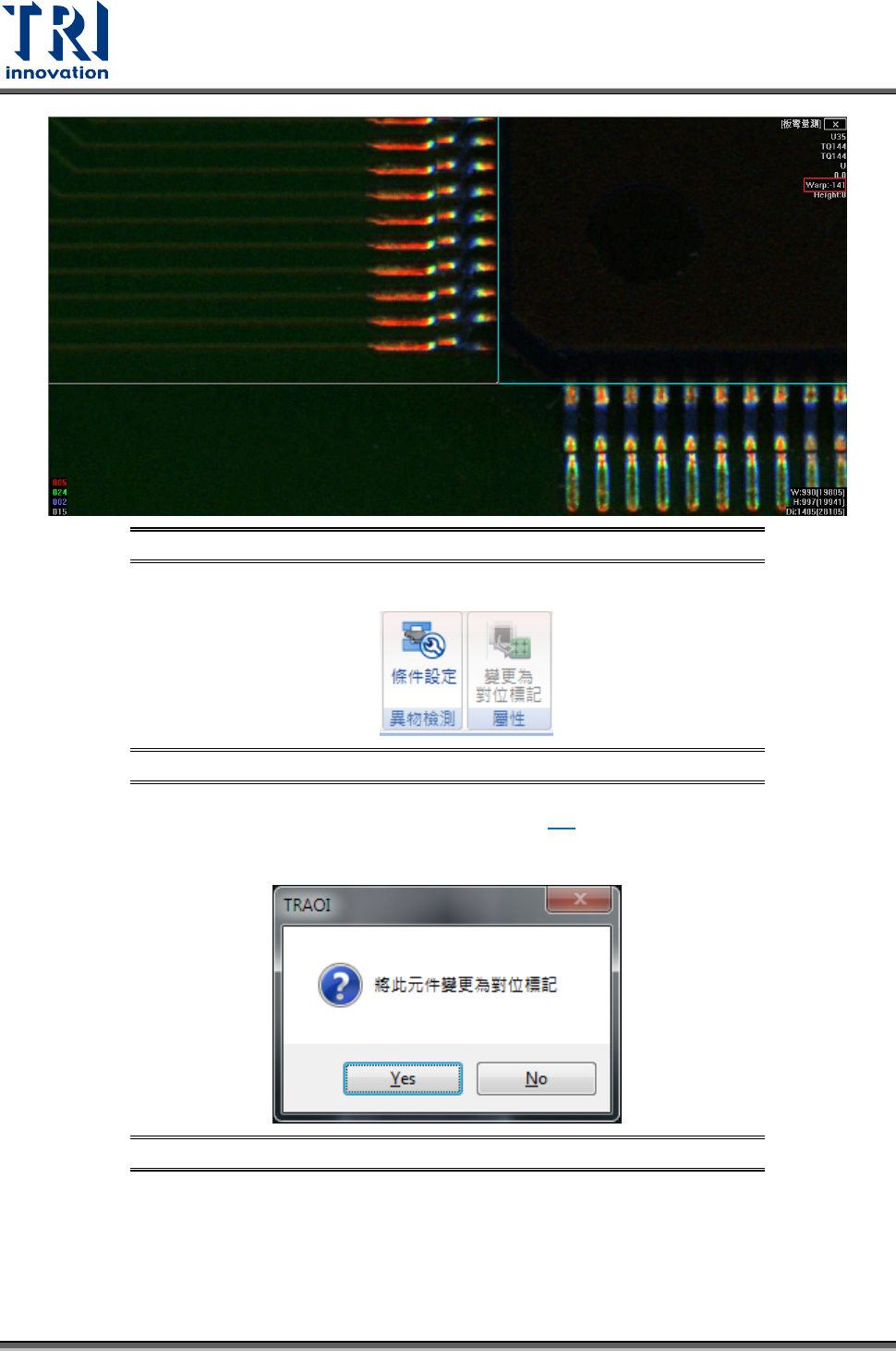 Test Research, Inc. 172 TR7500 SIII Series Us er Guide – Sof tware 圖 259 :板彎量測 功能示意圖 異物檢測 / 屬性 圖 260 :設為對位 標記視窗 • 條件設定 :使用異物檢測 功能,其詳細設定請參閱 8.1 。 • 變更為對 位標記:將所選 取的元件變更為對位標記。點選後 會出現以下視窗,選擇 [ 是 ] 來進行變動作。 圖 261 :變更為對 位標記視窗…