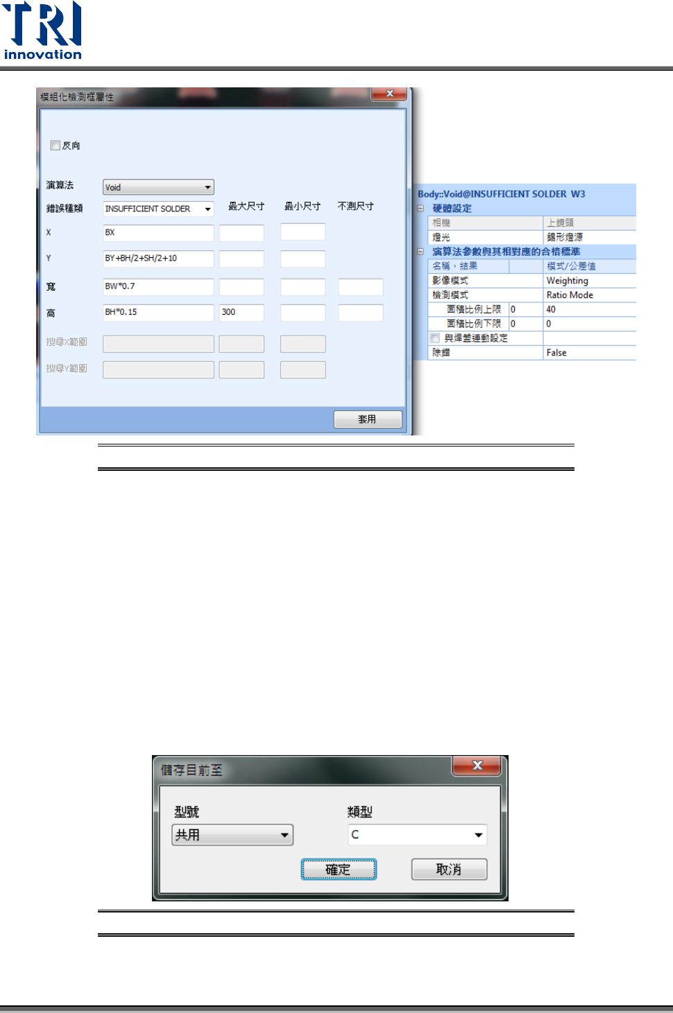 Test Research, Inc. 176 TR7500 SIII Series Us er Guide – Sof tware 圖 268 :模組化資 料庫編輯視窗 最大尺寸:公式所計算 出來的值,必須≦最大值。 最小尺寸:公式所計算 出來的值,必須≧最小值。 不測尺寸:當檢測框尺 寸符合條件時不產生該檢測 框。例如:設定 <300 ,表示 當尺寸計算結果小於 300 μm 時,此檢測框不會 產生,一般用在電 阻 0603 …
