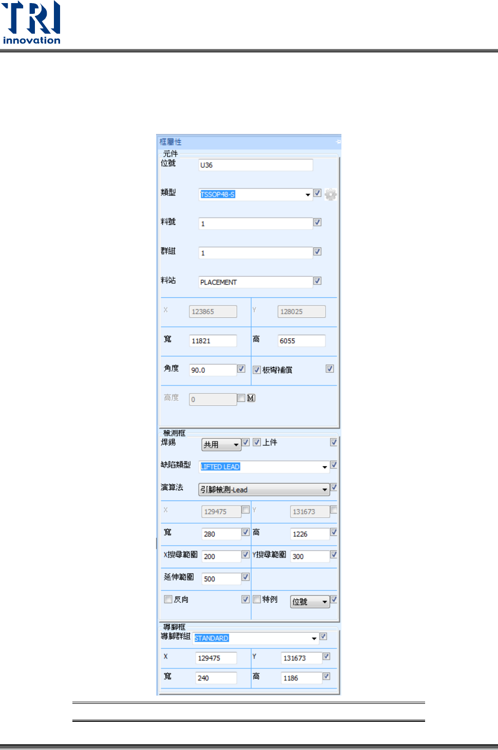 框屬性視窗的用途在於幫助使用者快速地變更所選擇的檢測框屬性及相關參數,其介面如下圖