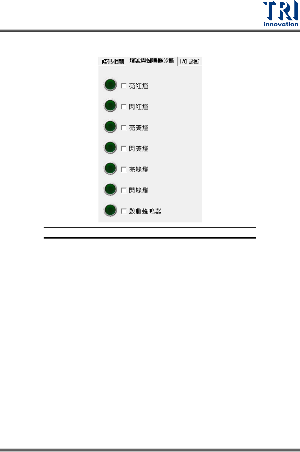 Test Research, Inc. TR7500 SIII Series User G uide – Soft ware 191 可程式控制器頁籤設定 – 燈號與蜂鳴器診斷 可直接手動下命令,測 試燈號反應是否正常。 圖 288 :燈號與蜂 鳴器診斷介面
