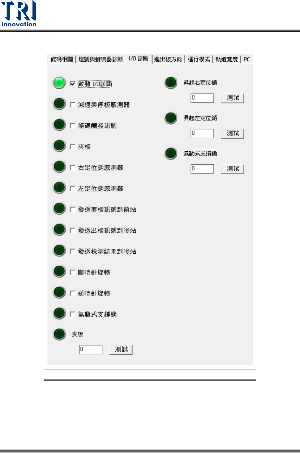 • 右定位銷感測器:測試右邊位銷感測器動作是否正常。
