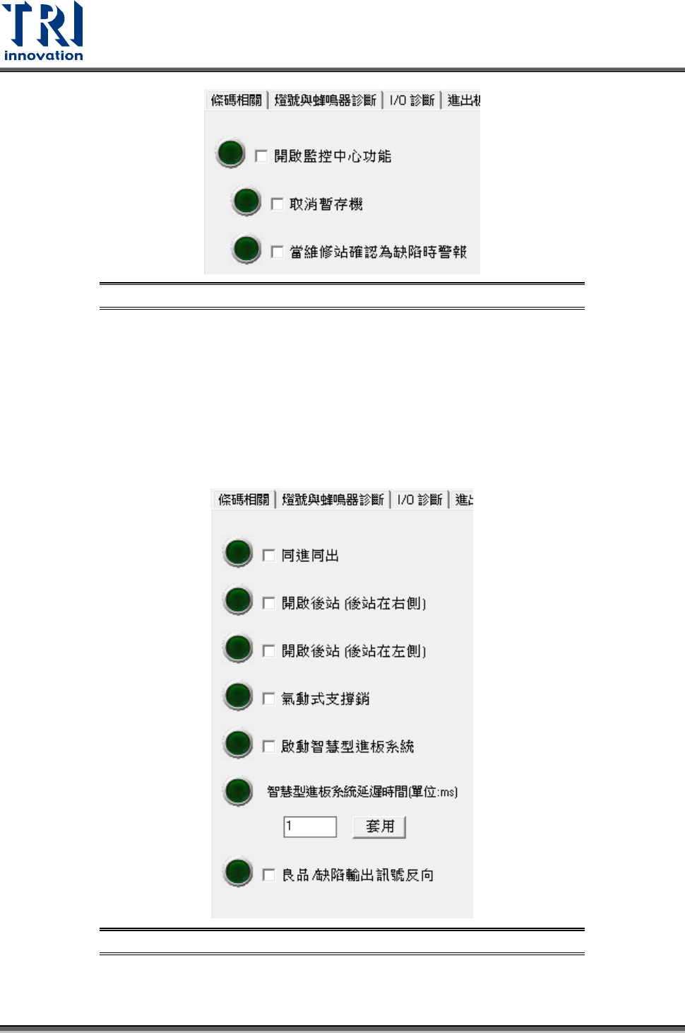 Test Research, Inc. TR7500 SIII Series User G uide – Soft ware 197 • 同進同出 :檢測完成出板 的同時,同步下要板訊號 讓進出板同時作 動,可節 省進出板 時間,如使用此功能再 搭配條碼時,需使用預讀 條碼功能, 否則條碼會對 應不上。 • 開啟後站 ( 後站在右 / 左側 ) :設定是否有後 站 ( 外接軌道 ) , 如無時當出板 時,板子僅 會停 在出板感測器 (S…