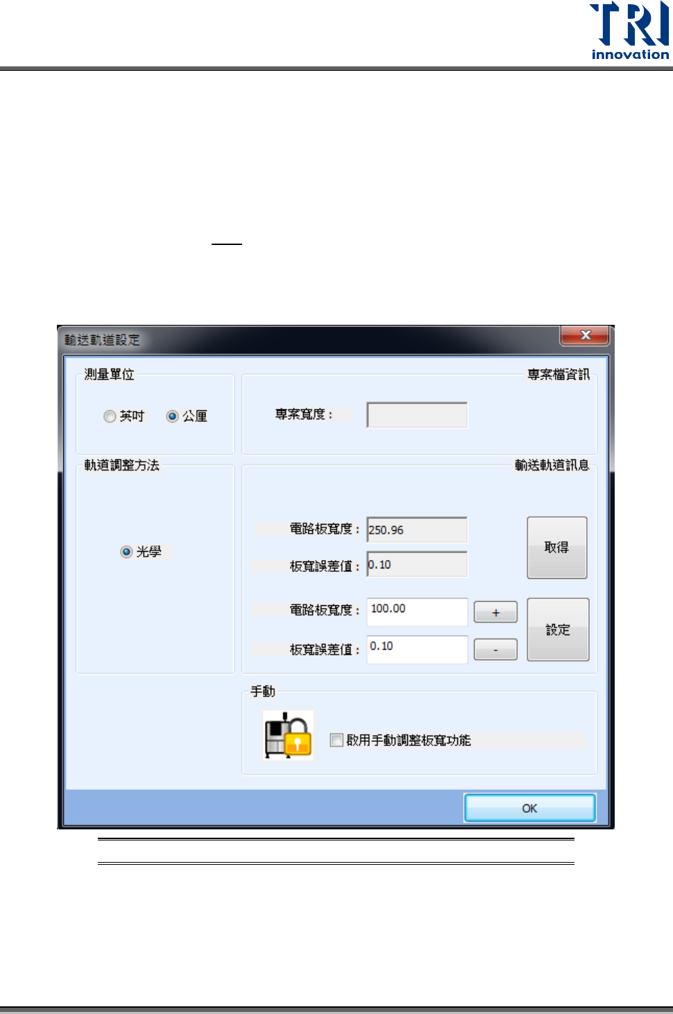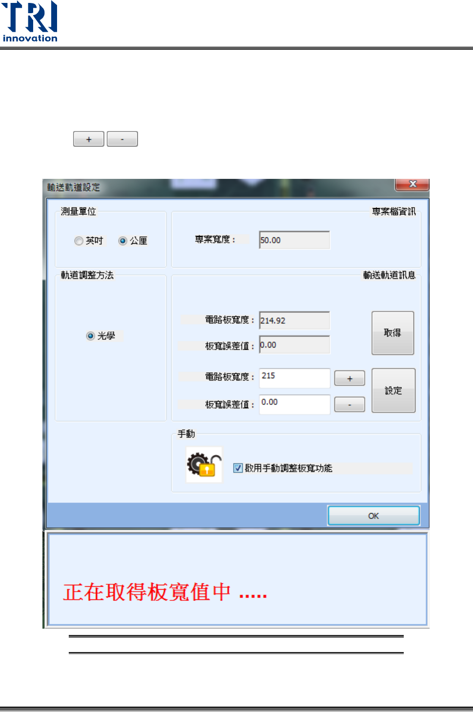 Test Research, Inc. 198 TR7500 SIII Series Us er Guide – Sof tware • 輸送軌道 訊息 − 電路板寬度:共 區分上下兩部份, 上半部為從現有板寬直接 計算出來顯示 ,下半 部為欲調整的軌道寬度 ,通常為機板寬度。 − 板寬誤差值 :如果軌 道寬度直接 設定為板子寬 度會造成無 法進板情形, 所以設定 進板的公差,這樣每次 只需輸入板子寬度即可直 接調整。 − / :可微調…