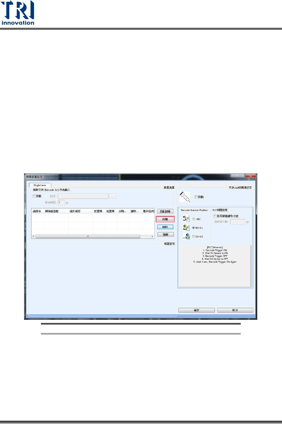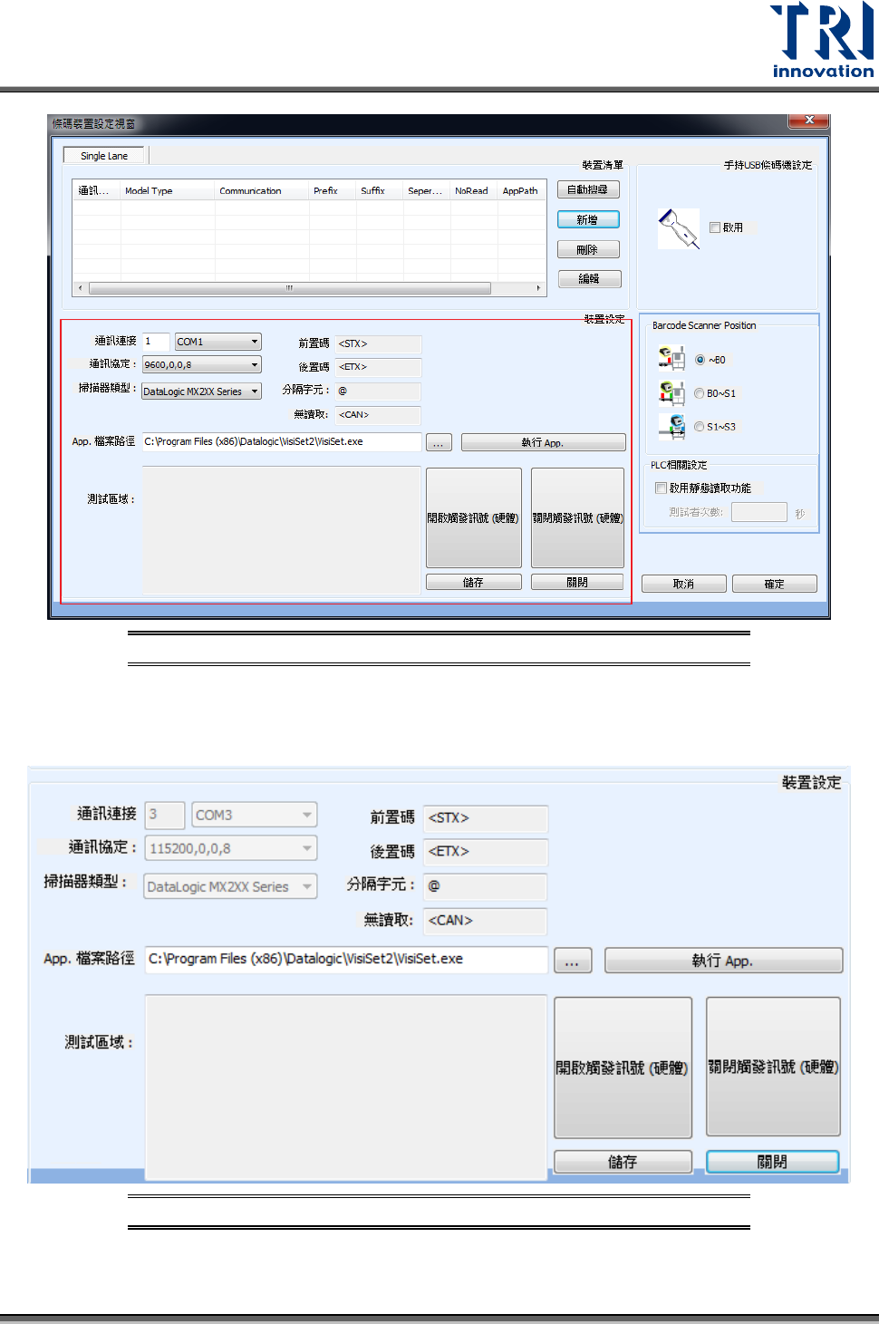 Test Research, Inc. TR7500 SIII Series User G uide – Soft ware 201 圖 302 :新增畫面 − 刪除:點選左邊 條碼機資料將其移 除。 − 編輯 :編輯條碼機資 料。灰色區域為機台辨識出 的欄位,無法手動修改。 如需修 改則需進入供應商提供 的 App 應用程式設定。 圖 303 :編輯畫面 通訊連接埠:對應電腦 的連接埠。