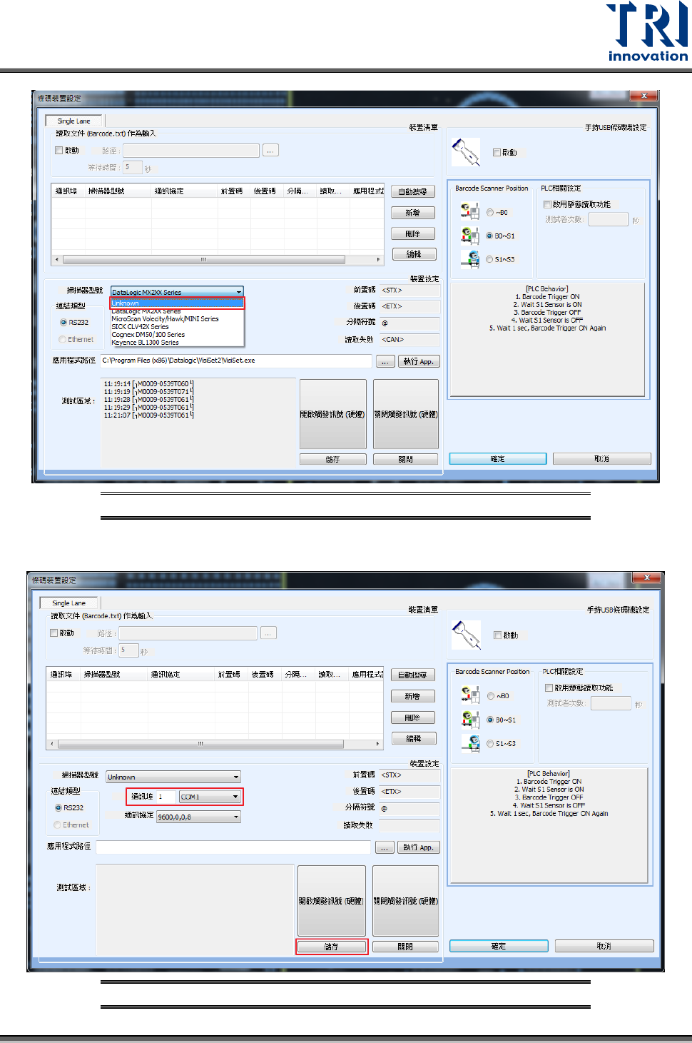 Test Research, Inc. 202 TR7500 SIII Series Us er Guide – Sof tware 前置碼:必須判斷前置 碼、後置碼中間的字串才是 所需要的資料。固定為 <STX> 。 後置碼:必須判斷前置 碼、後置碼中間的字串才是 所需要的資料。固定為 <ETX> 。 掃描器類型:目前支援 Datalogic 、 MicroScan 、 Sick 、 Cognex …