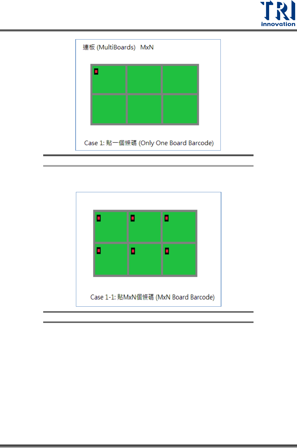 Test Research, Inc. TR7500 SIII Series User G uide – Soft ware 207 圖 313 :條碼應用 – 多連板 Case 1 • Case 1-1 : 多連板 (M xN) ,貼多個條碼; 建立檢測框時 , 框的排板方式要選 擇 Boa r d( All ) ,各小板帶 出各小板條碼 。 圖 314 :條碼應用 – 多連板 Case 1-1 • Case 1-2 : 多連板 (M…