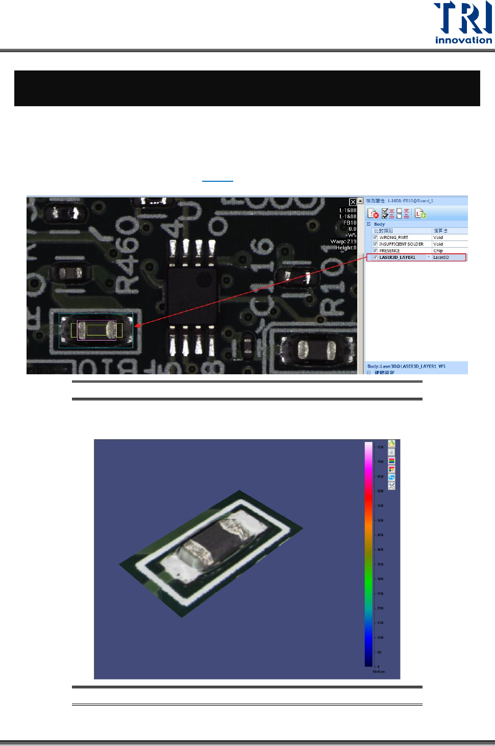 Test Research, Inc. TR7500 SIII Series User G uide – Soft ware 237 7 選配功能 ( 7500 SIII 3D 為標配功能 ) 7.1 3D 檢測功能 當機台裝有 3 D雷射檢測 裝置時,使用者可以在欲檢測 3D 模組的元件位置加上 Laser3D 檢測 框 ( 檢測框放置位置與 參數 說明請參閱 3.7.17 ) ,如下圖所示。 圖 353 : Laser 3D 檢測框…