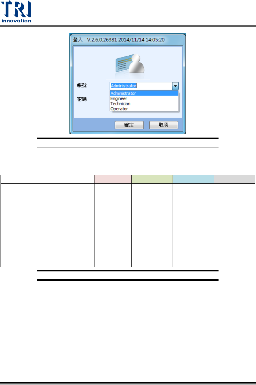 除了管理者(Administrator)帳號外,系統還提供工程師(Engineer)、技術人員(Technician)與操