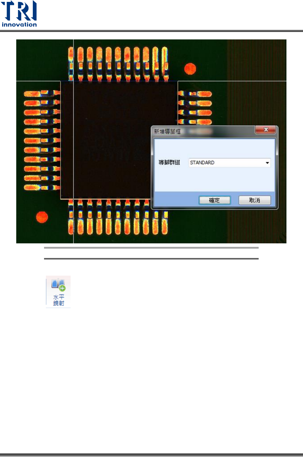 Test Research, Inc. TR7500 SIII Series User G uide – Soft ware 37 圖 47 :水平鏡射 產生導腳框 10) 點選這兩個導腳框後,再 次按下 。 11) 此時系統會自動跳出增加 導腳框的視窗。輸入這 兩個導腳框間總共要產生 的導腳框數 量 ( 需包含已選擇的兩 個導腳框 ) ,然後按下 ” 確定 ” 。 圖 48 :產生多個 導腳框視窗 12) 系統會依照先前的設定, 產生…