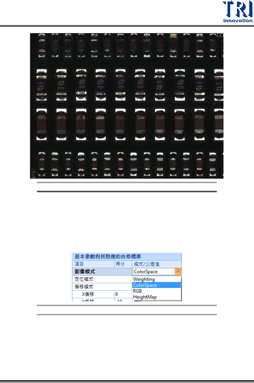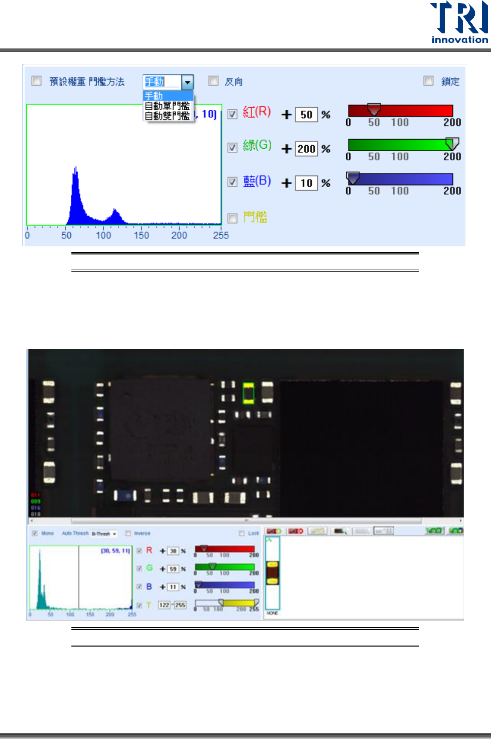 Test Research, Inc. 46 TR7500 SIII Series User G uide – Soft ware 圖 60 :權重法介 面 一般而言,彩色圖像轉 成灰階圖像作影像處理時 ,灰階值的 計算公式是紅 色階值 * 紅權 重比例 + 綠色階值 * 綠 權重比例 + 藍色階值 * 藍權 重比例。其紅 權重比例預設 值為 0.3(30%) ,綠權重 比例預設值為 0.59(59 %) ,而藍權重比例 預設值為 0.…