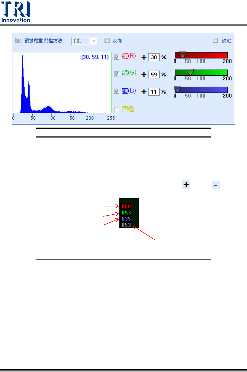 的灰階值,其操作介面如下圖所示。左方的直方圖為此檢測框內依據所設定權重下的